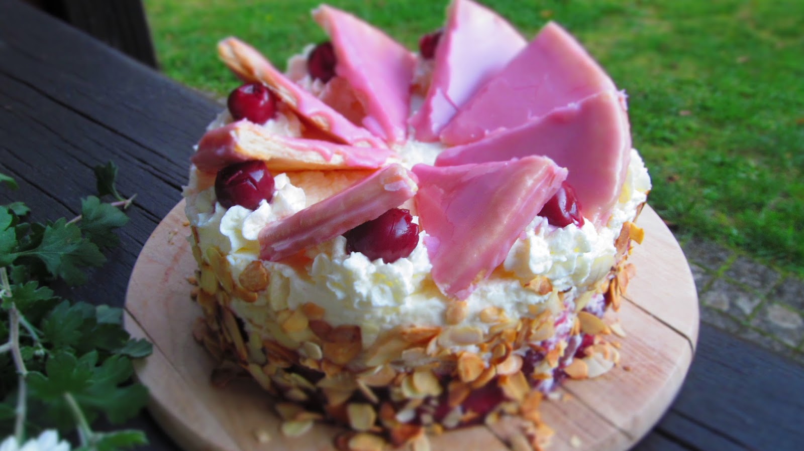 - Върху охладената торта шприцовам толкова розички, колкото парчета ще има тортата /12/ и върху тях слагам отделените от компота черешки.