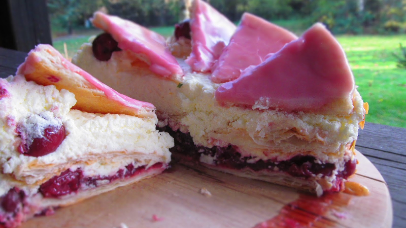 - С тази розова захарна глазура заливам намазания предварително с черешово желе отделен блат.