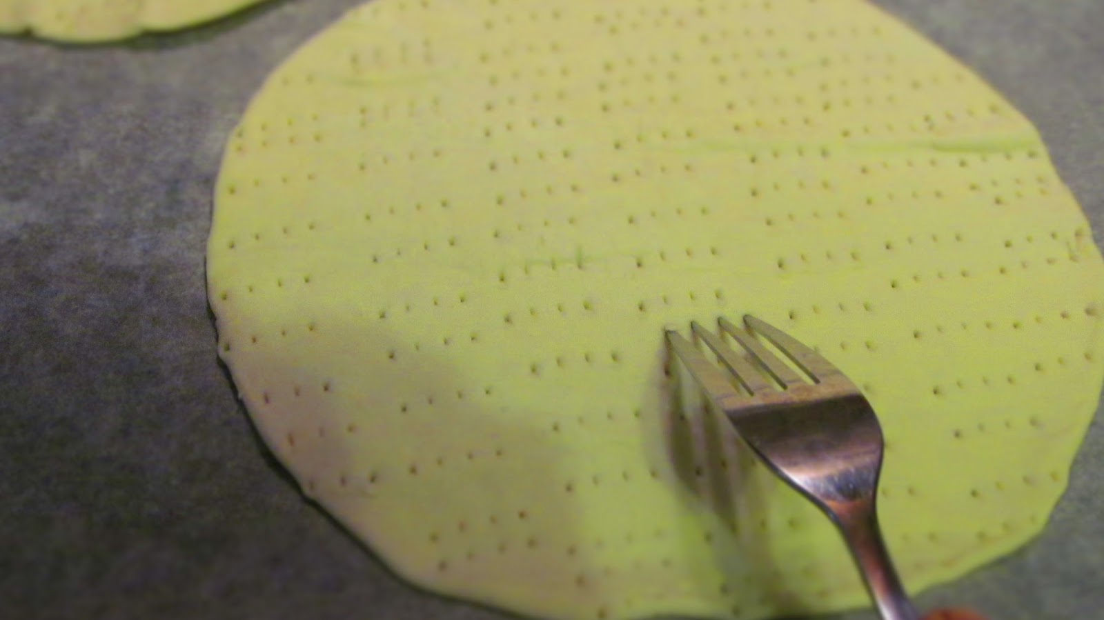 - Подреждам в тава с хартия за печене и надупчвам с вилица, за да не се получават балончета по време на печенето.