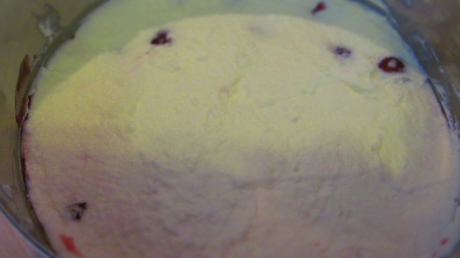 - Две трети от леко желираната сметаната изсипвам върху стегналия вече черешов компот. Изравнявам.