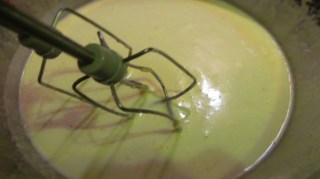 - Тази смес за яйчения ликьор я слагам върху тенджера с вода и включвам котлона. Старая се дъното на купата да не опира във водата. Така ми е по-спокойно. Разбивам яйцата непрекъснато с миксера и върху водната баня или по-скоро при мен това е на пара. Разбиването е минимум 6 минути.