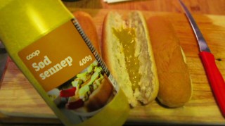 - Както Йенс показа в разполовените затоплени хлебчета се слага първо достатъчно количество горчица.