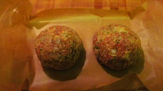 - Оформям две топки от омесената добре кайма, които слагам подходяща тавичка, покрита с хартия за печене.