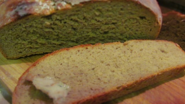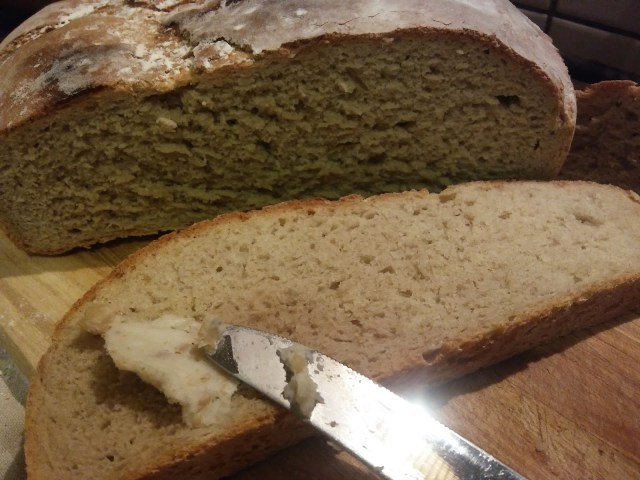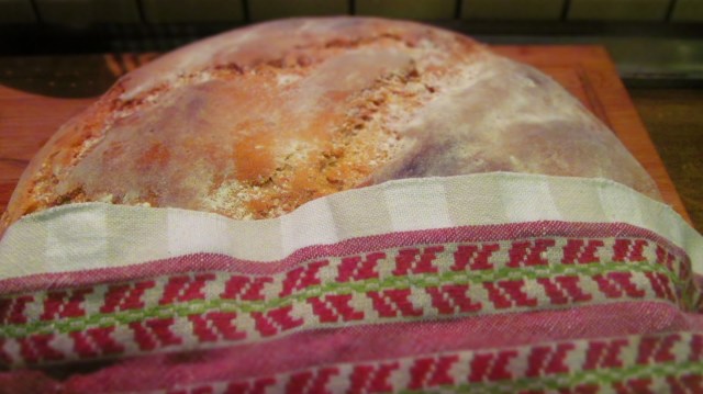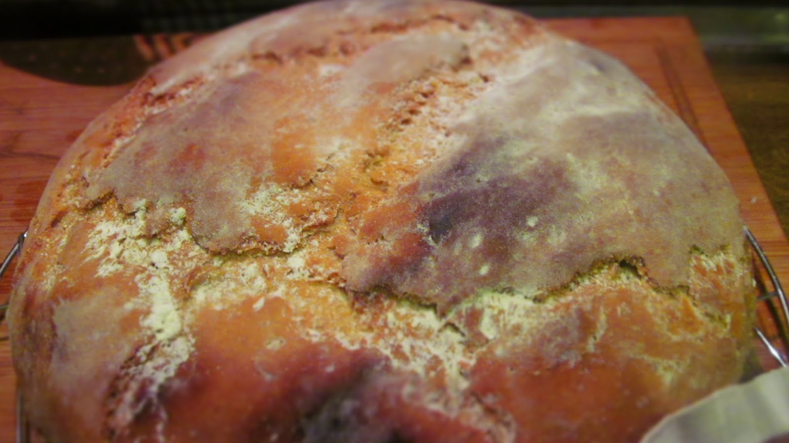 - Готовия хляб изваждам върху решетка да се охлади много добре. Ако го нарежете топъл има опасност да остане длетав. Намазвам със студена вода, а когато водата се изпари поръсвам с брашно за автентичност.