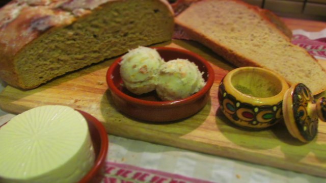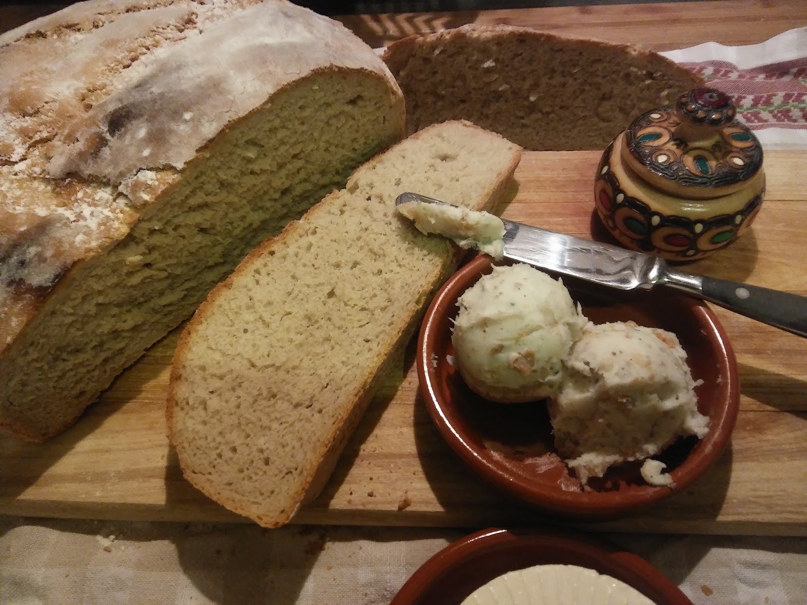 Този невероятно ароматен и вкусен хляб може човек да го похапва и сух, но аз го сервирах със свинска мас с пръжки, като едно време, сирене и шарена сол. Много вкусно! Какво му трябва на човек?!