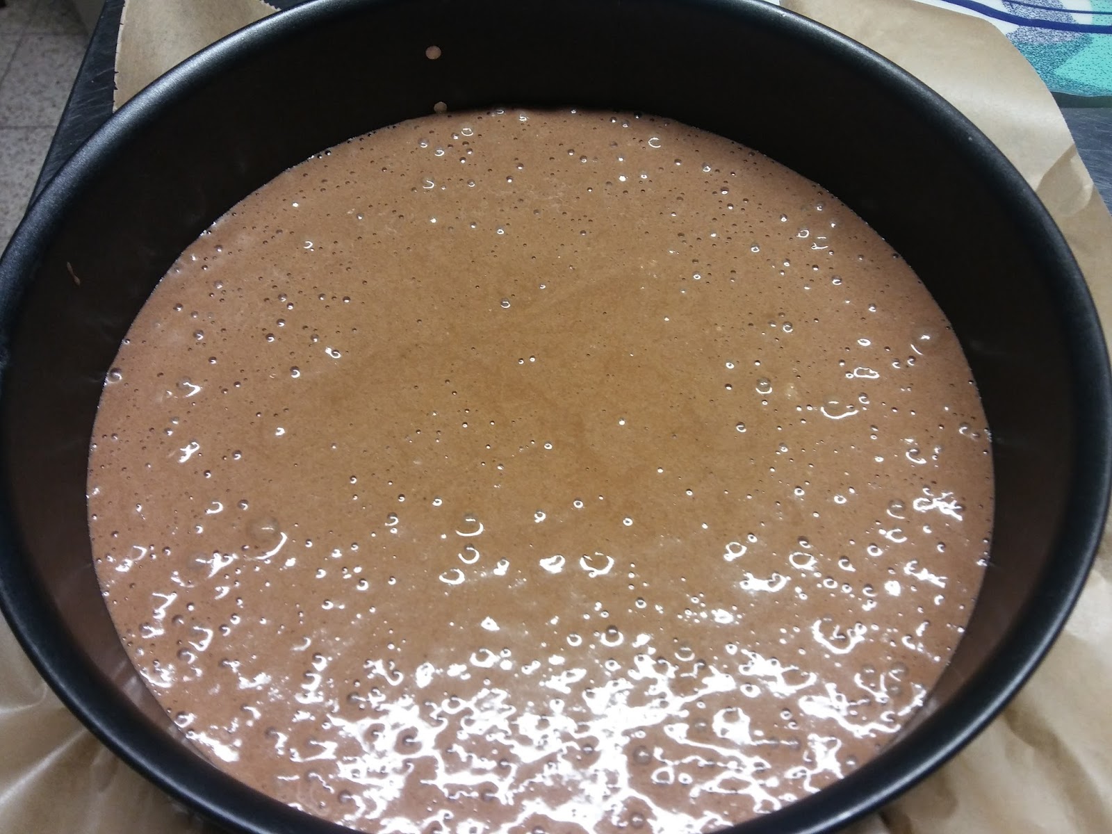 • Готовото тесто изсипвам във формата за торта, на която предварително съм защипала хартия за печене на дъното и съм намазала с олио.