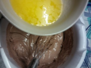 • Когато пухкавата смес ми е готова, добавям леко охладеното масло на много тънка струйка /почти капка по капка/ и продължавам нежно да разбърквам пухкавото тесто.