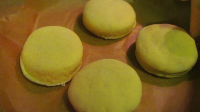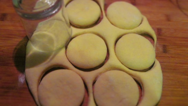 - С помощта на чаша изрязвам 12 кръга, като разбира се използвам и изрезките. Може обаче и да разделите тестото на 12 части и да си оформите 12 топки. Това е въпрос на Ваше виждане. Важното е да са много еднакви поничките.