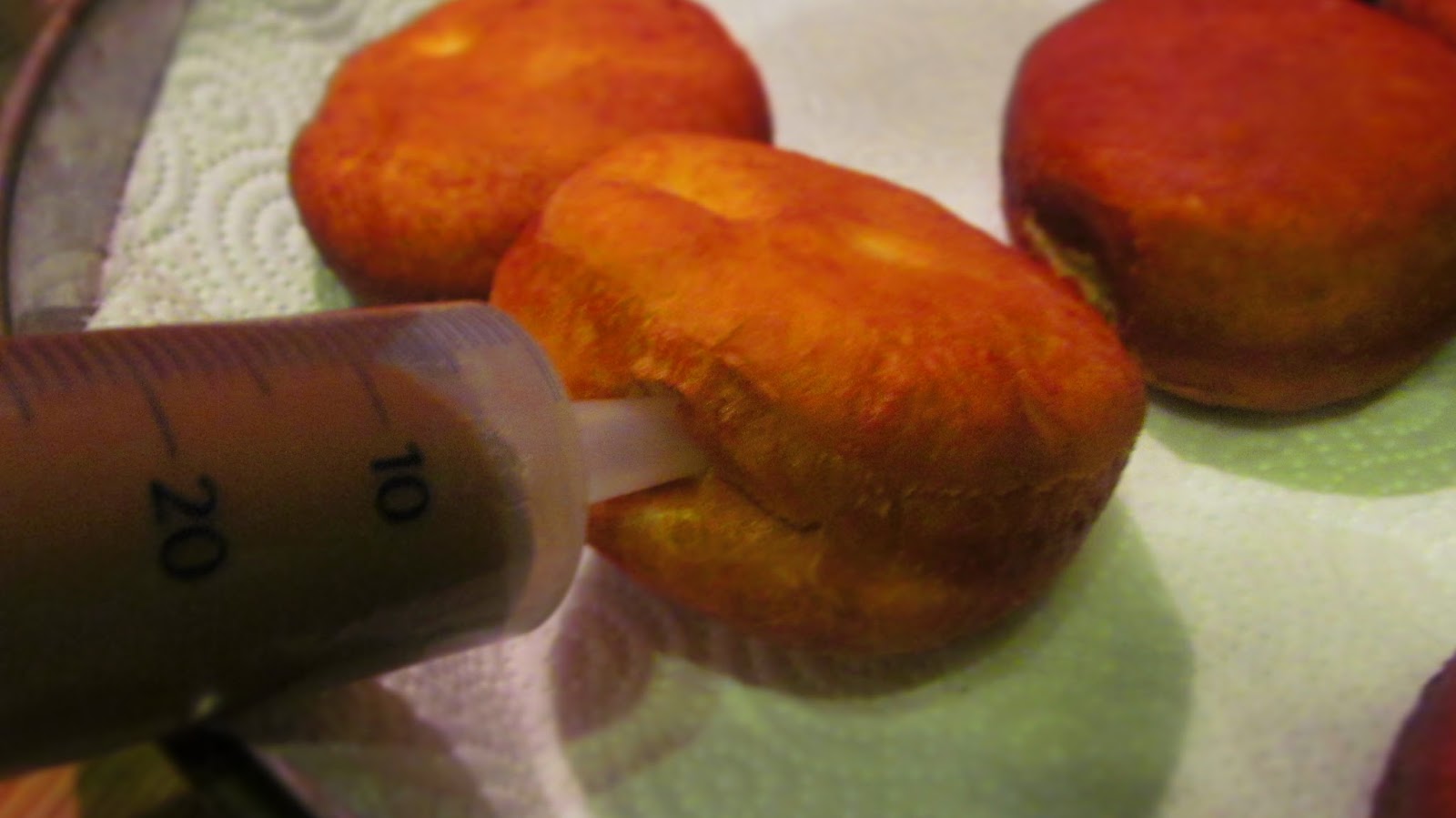 - Шприцвах достатъчно шоколад в средата на всяка охладена поничка. Не се налага да правя някакви разрези, защото спринцовката си прави дупка в поничката.