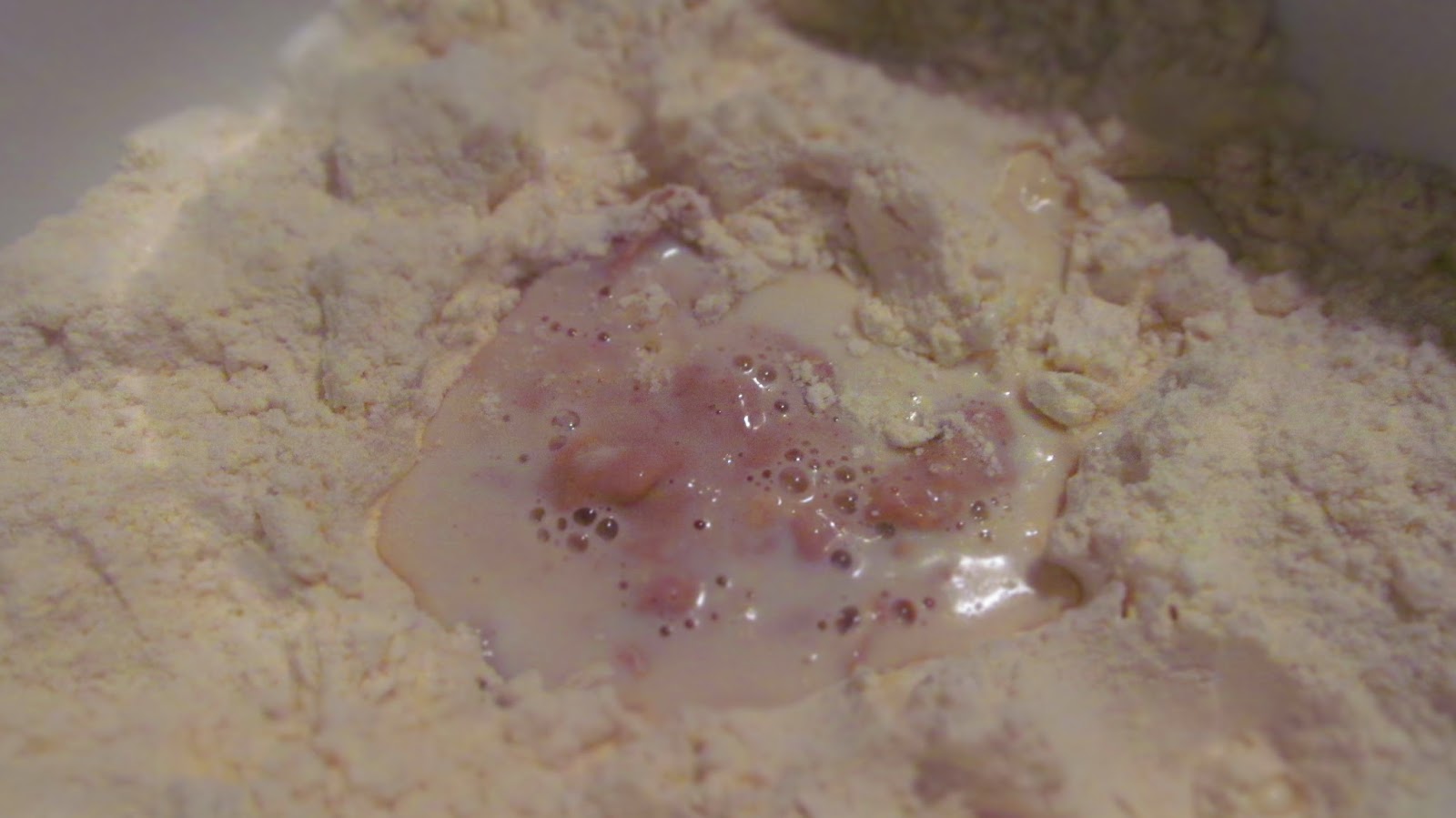 - В купа смесвам брашното, захарта и солта. Разбърквам и правя кладенче.
