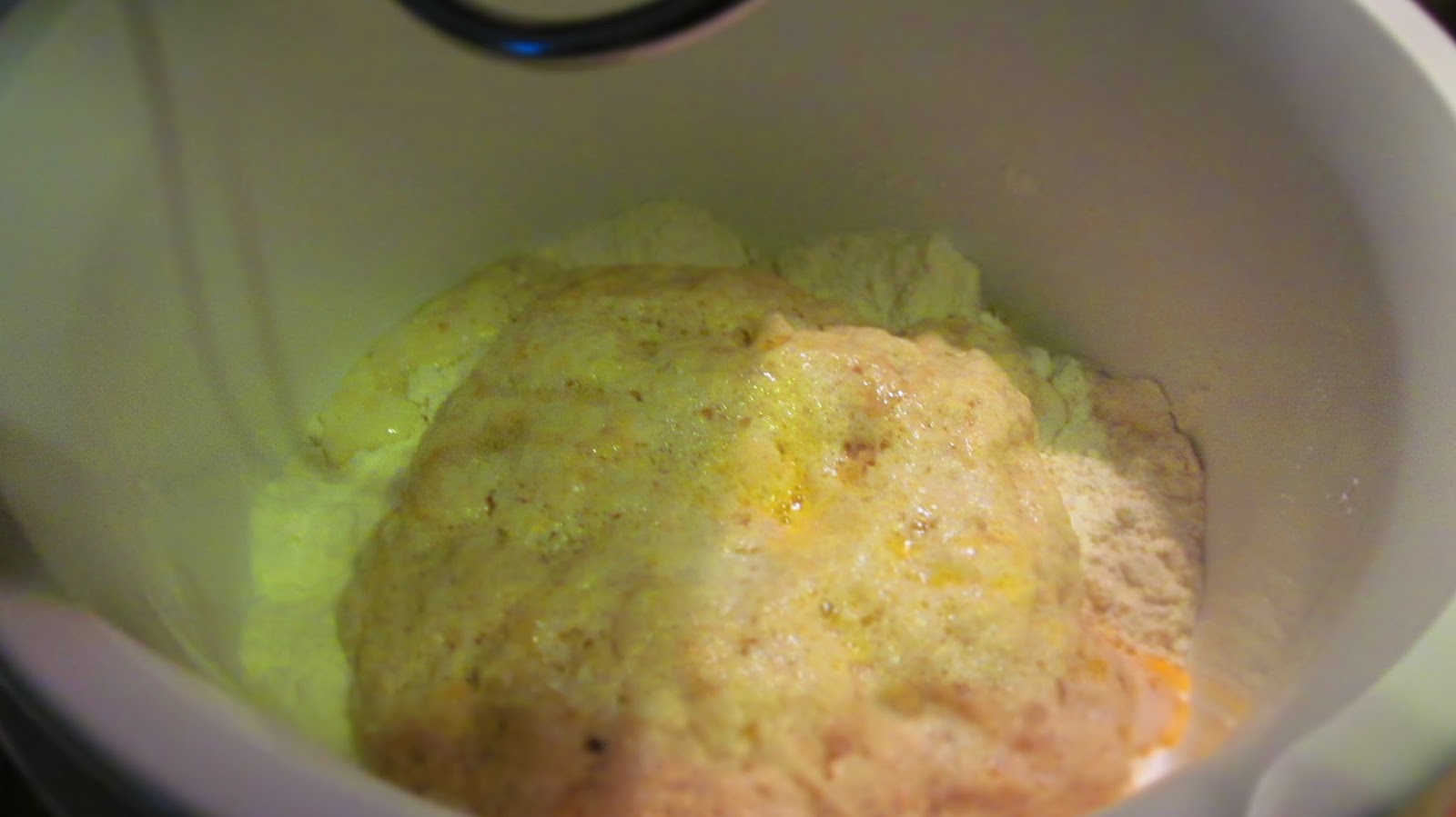 - Включвам миксера с накрайниците за тесто първо на първа степен и меся до поемането на цялото тесто, а после увеличавам до втора степен.