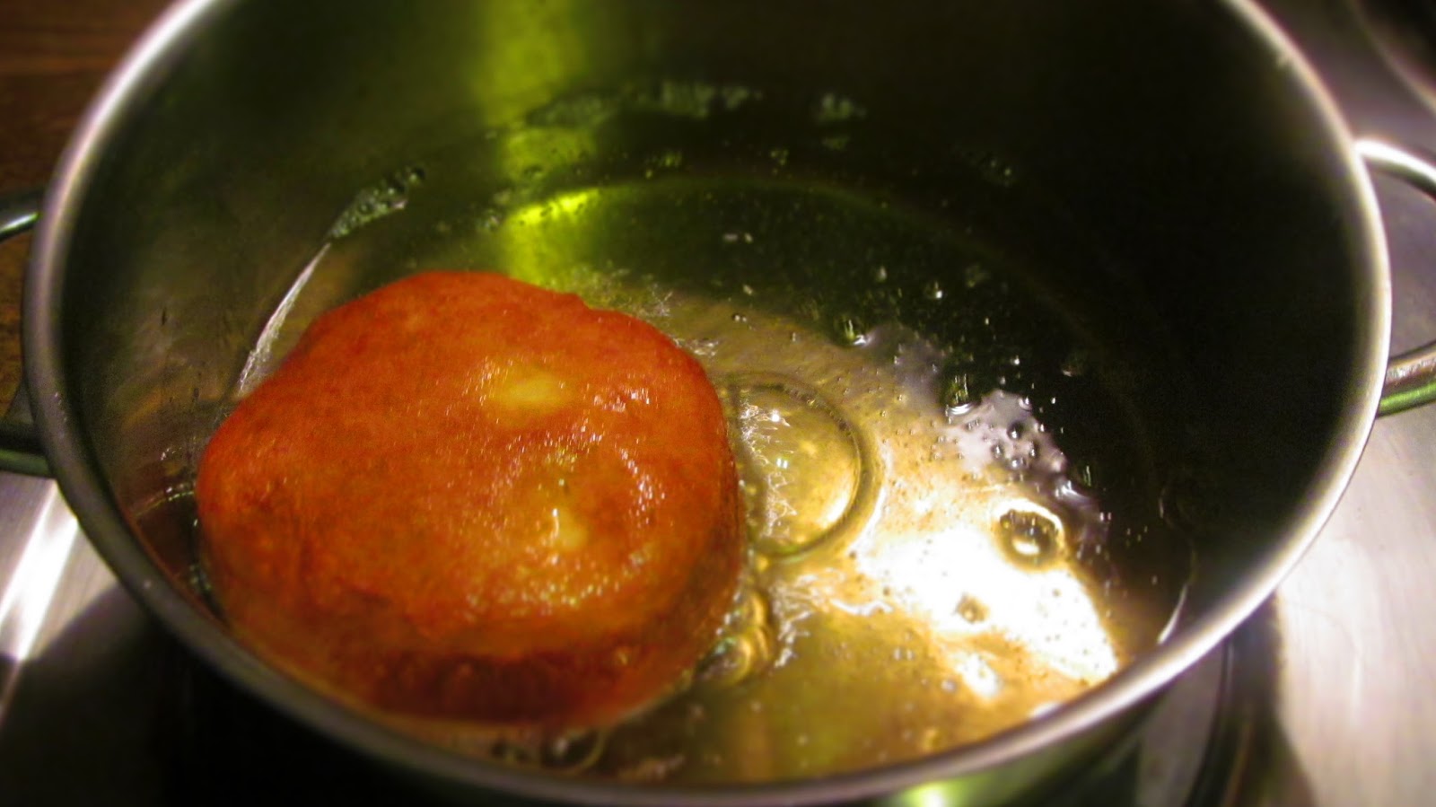 Пържа по една мекица в малък съд. Така хем икономисвам мазнина, хем мога да си контроирам поничките. Ако са много ще ги изпусна и ще изгорят.
