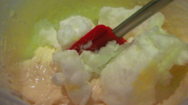 - Най-накрая добавям разбитите на сняг белтъци, но не разбивам повече с миксер – най-добре тел за разбиване да се използва.