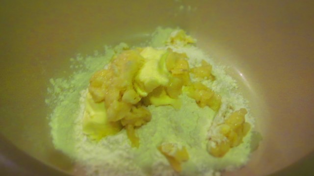 - В същата купа, без да я измивам смесвам жълтъците, разтопеното масло и пасирания банан.