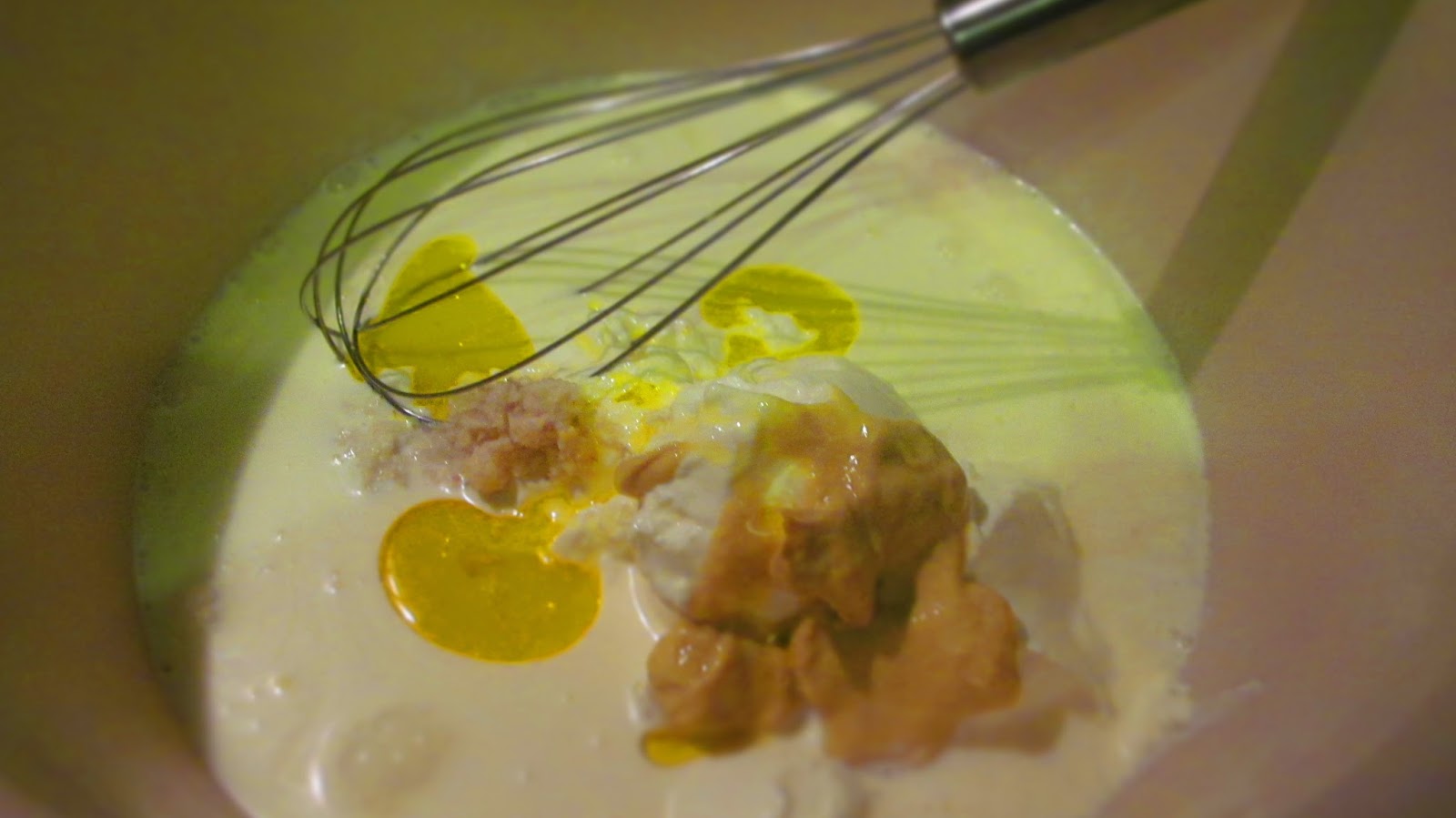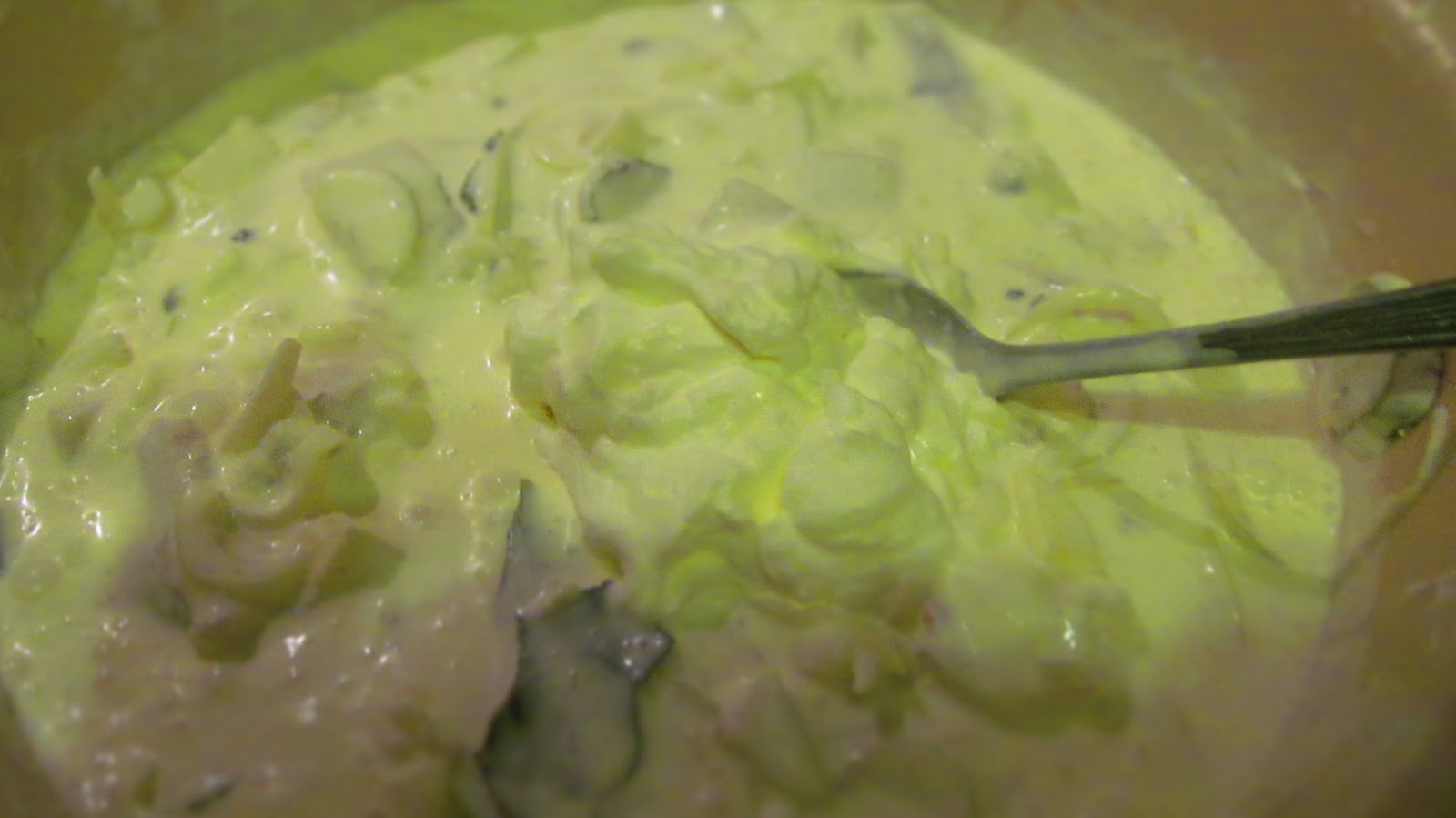 - В купа смесвам заквасената сметана, горчицата, хряновата паста, олиото и разбивам с тел.