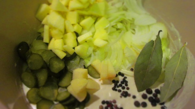 - Добавям нарязаната на кубчета ябълка, нарязания на лентички кромид лук, нарязаните на тънки филийки мариновани краставички, всички зърна от подправки и листата дафинов лист. Разбърквам.