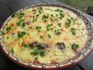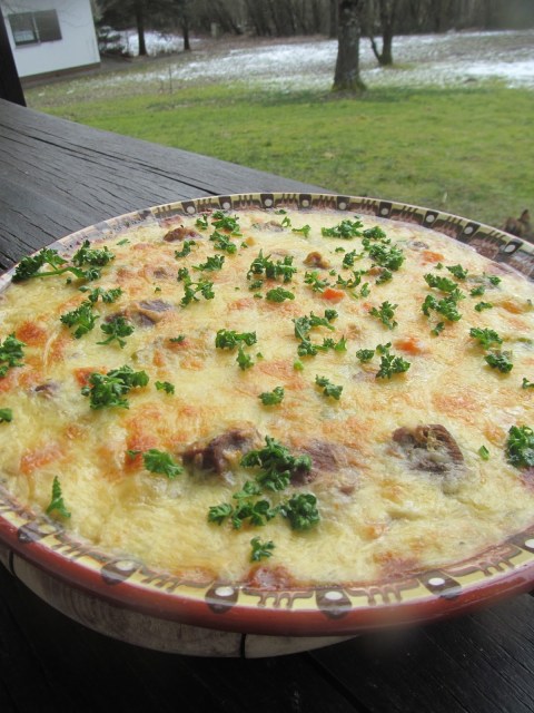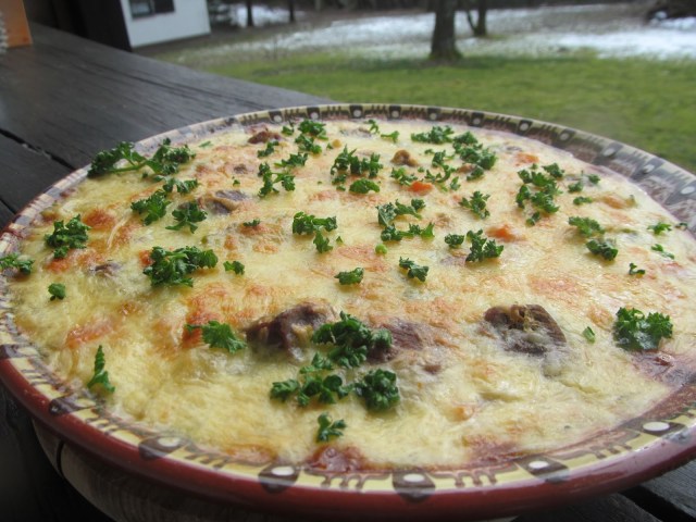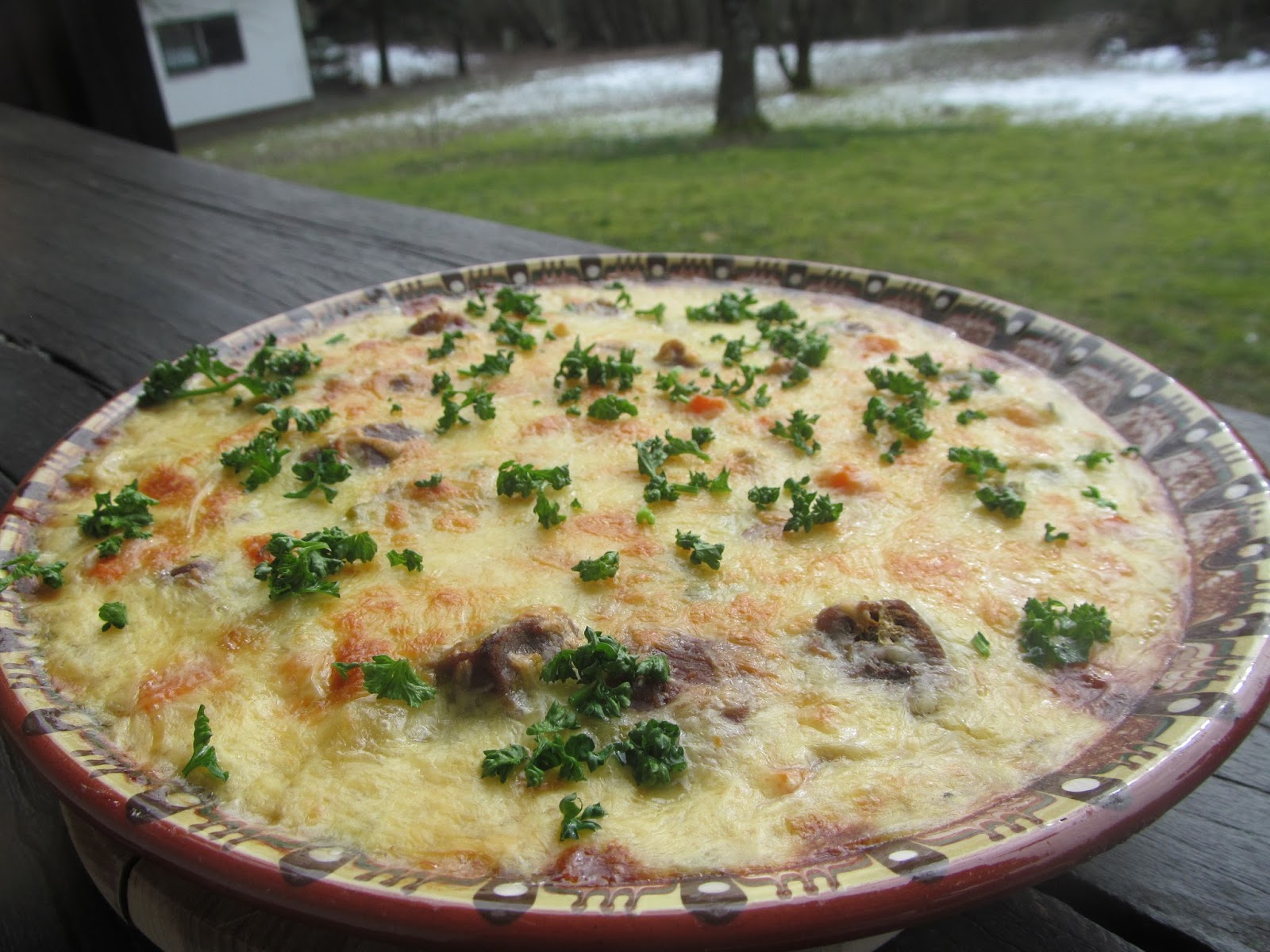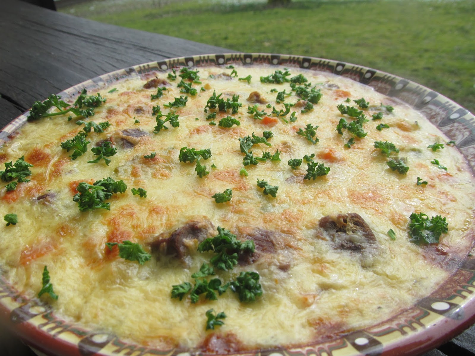 - Слагам ястието в студена фурна, заради керамичната чиния и пека поне 30 минути или до получаването на златиста коричка.