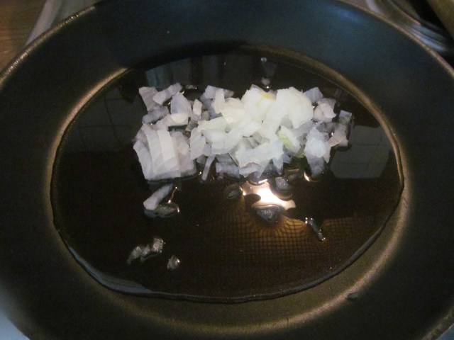 - В тиган загрявам мазнината и изпържвам за кратко нарязаната на ситно глава лук.