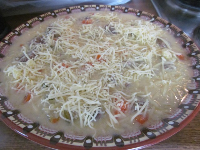 - Заливам месото с готовия сос и поръсвам с настъргания кашкавал.