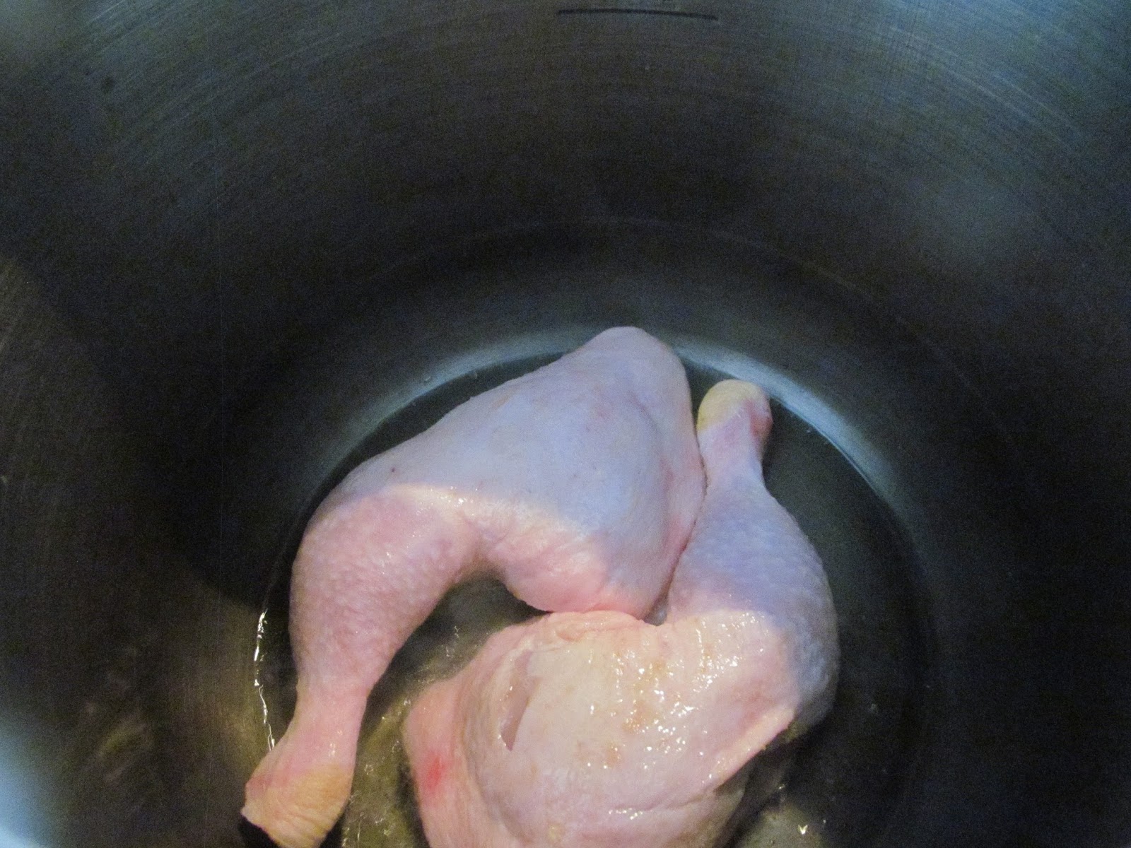 - На дъното на тенджерата под налягане загрявам олиото и в него изпържвам за кратко пилешките бутчета. Целтта на изпържването е подсилването на пилешка супа и избягването на препенването на бульона. Но, ако случайно избягвате пърженето – просто покрийте бутчетата със студена вода и сварете. Но задължително по време на завирането, трябва да сте до тенджерата и да препените бульона /премахване на образувалата се пяна с решетъчна лъжица, за да остане бульонът бистър/.