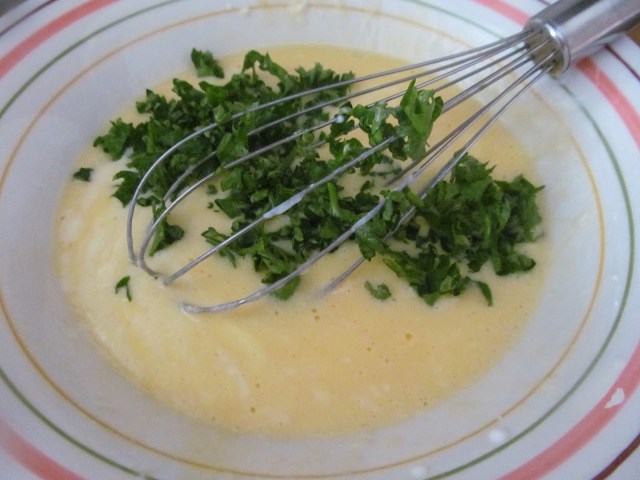 - В купата си подготвям застройката, като разбивам яйцата с киселото мляко и ситно нарязания магданоз.