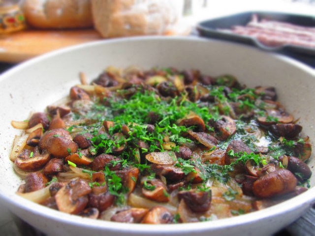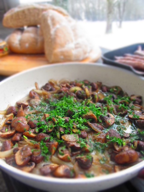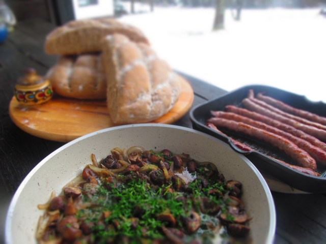А на масата – вкусен домашно изпечен хляб с брашно от спелта /рецепта тук/, банско кърначе купено от новия български магазин в Трир и изпечено на грил тигана /за скарата е доста студено, пък и снегът я затрупа/, великденска салата /рецепта тук/ и…вкусно тиганче с хрупкави гъби.