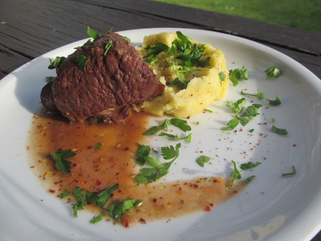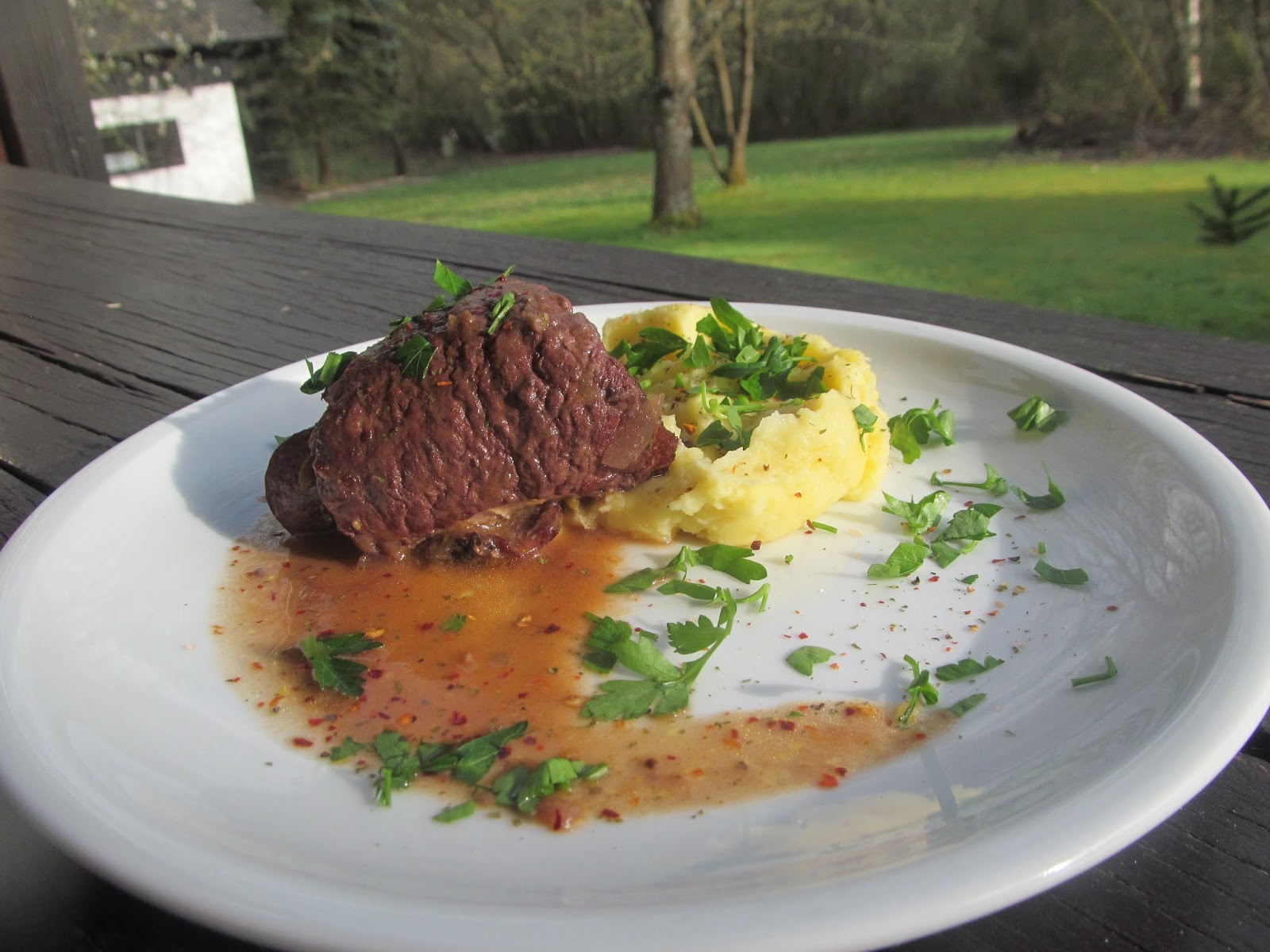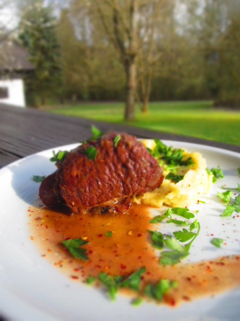 Сервирам рулцата върху пюре и поляти с вкусен винен сос.