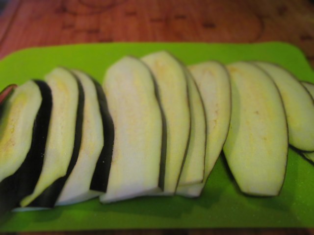 • Патладжанът нарязвам по дължина на тънки филийки, които посолявам и след 10 минути подсушавам с домакинска хартия.