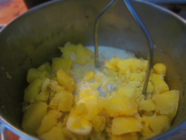 • През това време сварявам един килограм картофи, които намачквам по най-старата технология на пюре, към което добавям 50 гр масло и около 100 мл прясно мляко. Това е гарнитурата на вкусното ястие.