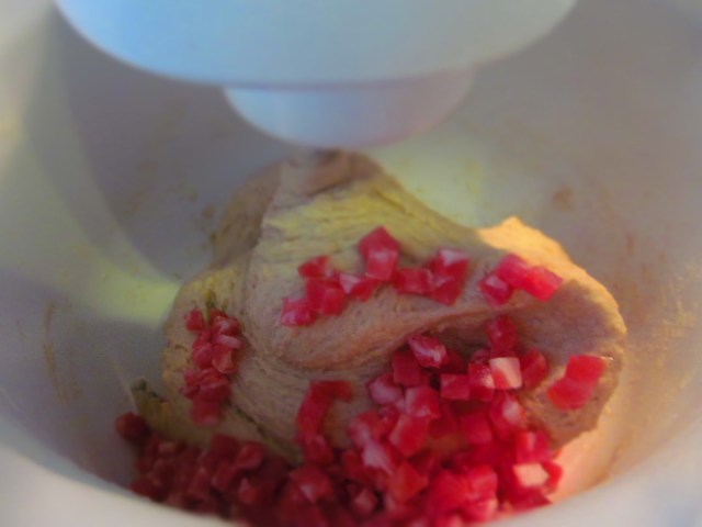 - В купата на миксера смесвам всички съставки, без шунката и с накрайника за тесто меся минимум 5 минути или до гладко и нелепнещо тесто.