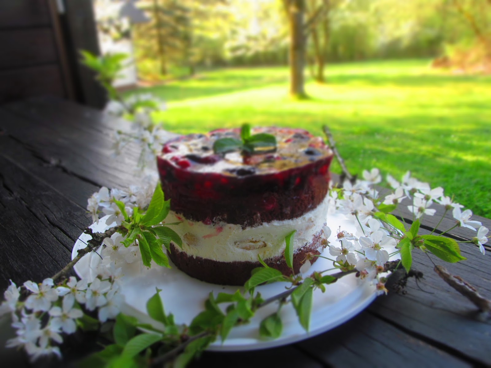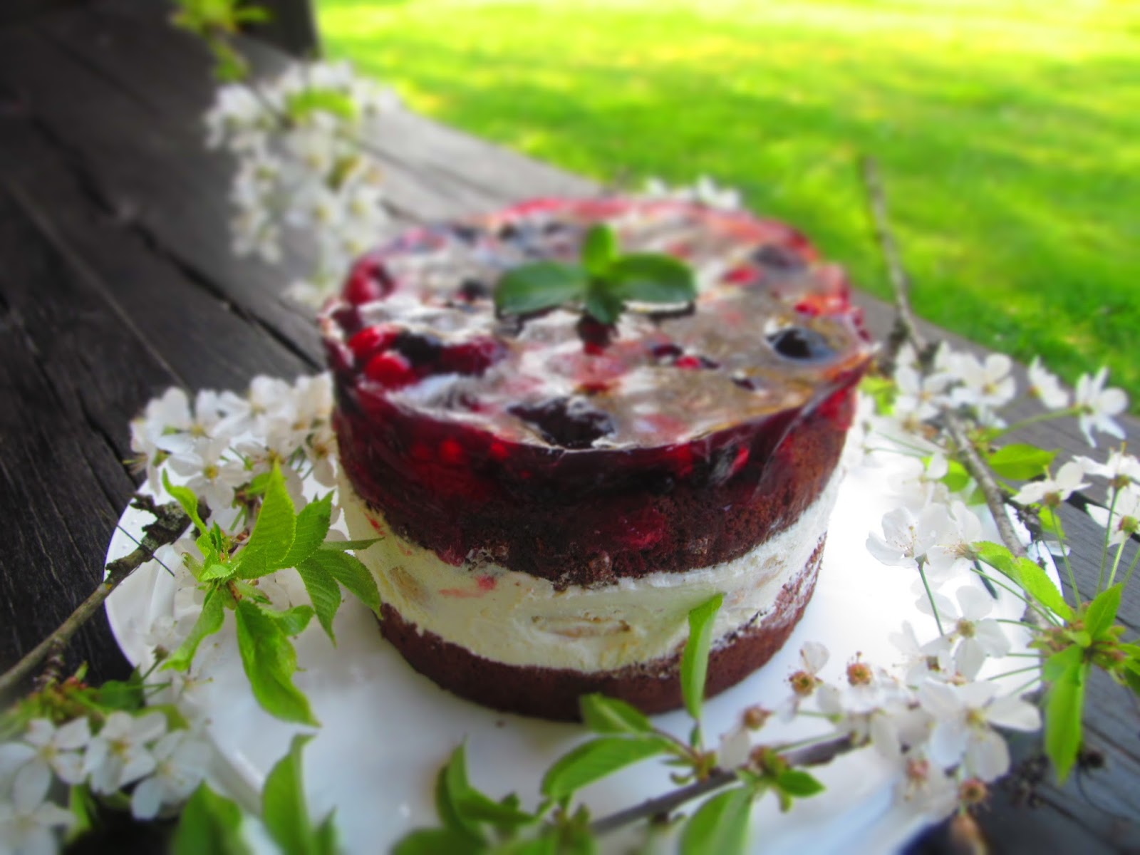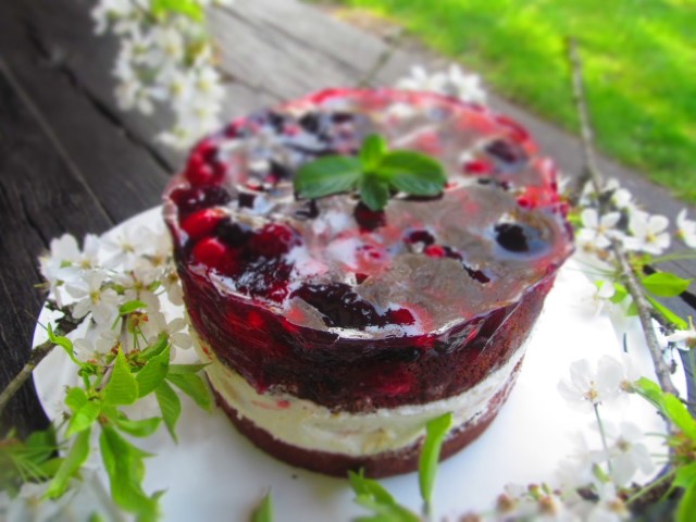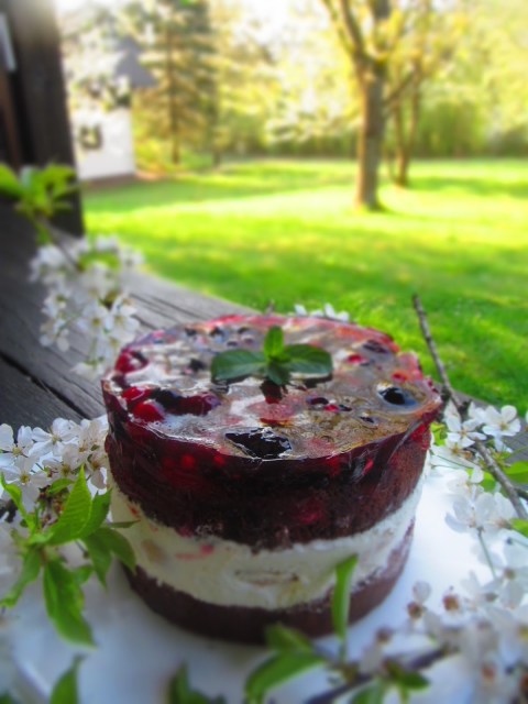 Днешната торта е едно съчетание на шоколадов пандишпанов блат, чиято рецепта съм описала ето тук и заквасена сметана, която е желирана с помощта на желиращата захар и замразени еклерчета. Капачето на тортата е от замразени горски плодове, желирани с помощта на тортен гус.