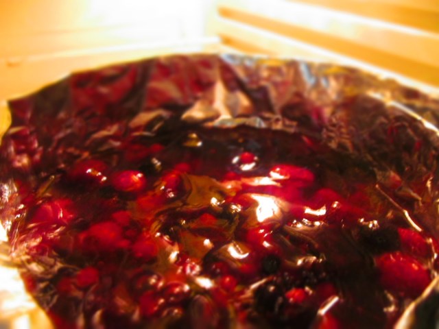 - Изсипвам върху втория блат плодовете, които също не съм размразявала предварително. Използвам плодовете замразени.