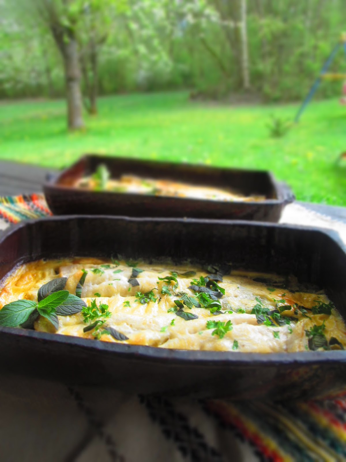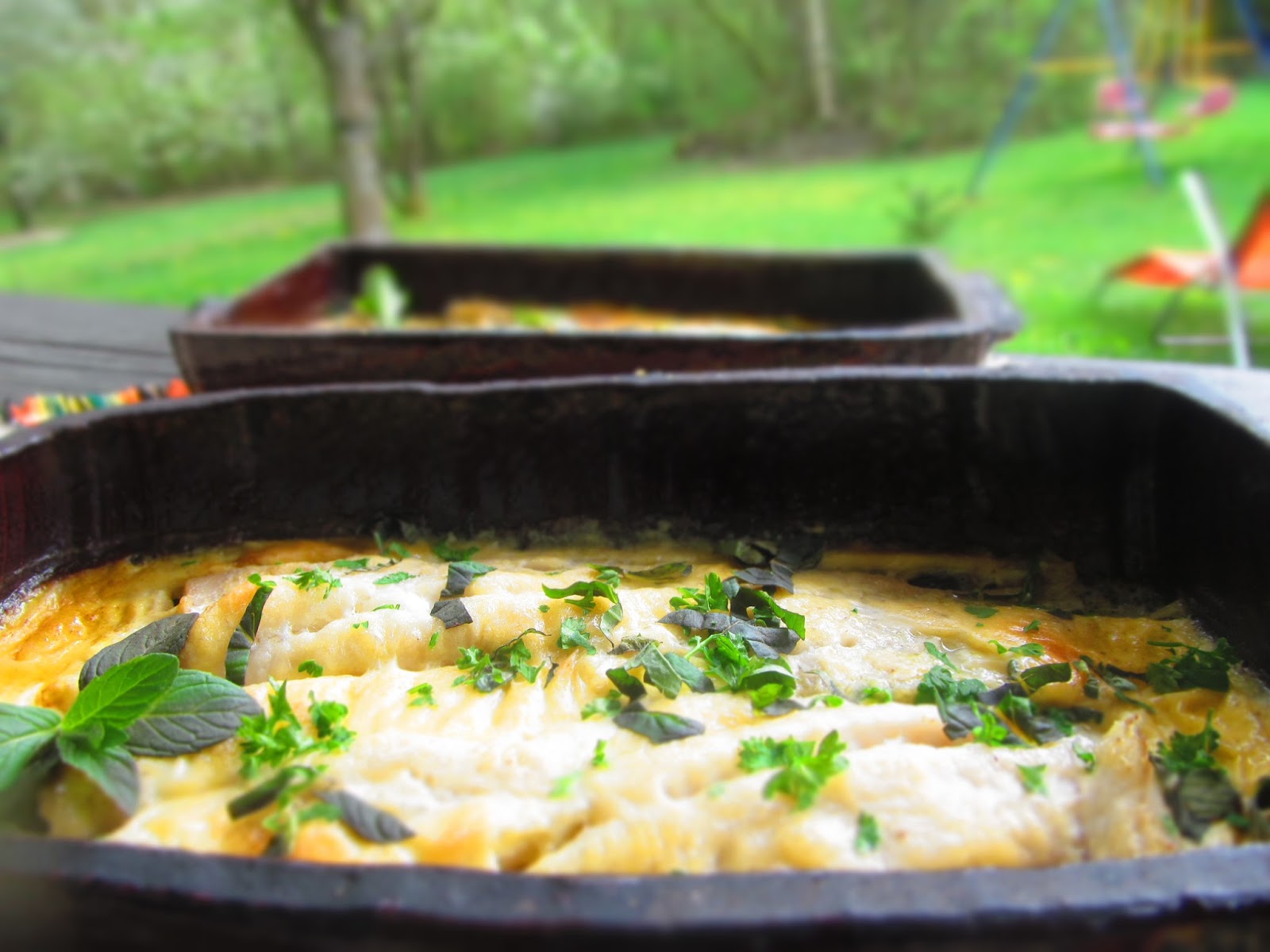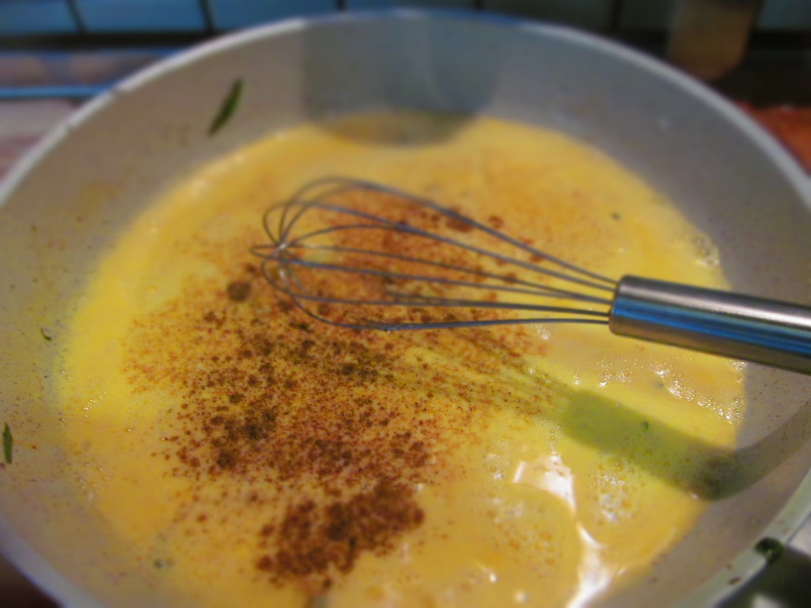 - В тигана от приготвянето на зеленчуците разбивам яйцата с прясното мляко. Поправям със сол, черен пипер и индийско орехче. Разбивам точно тук яйчената смес, защото така обирам и най-малкото останало от вкусния спанак.