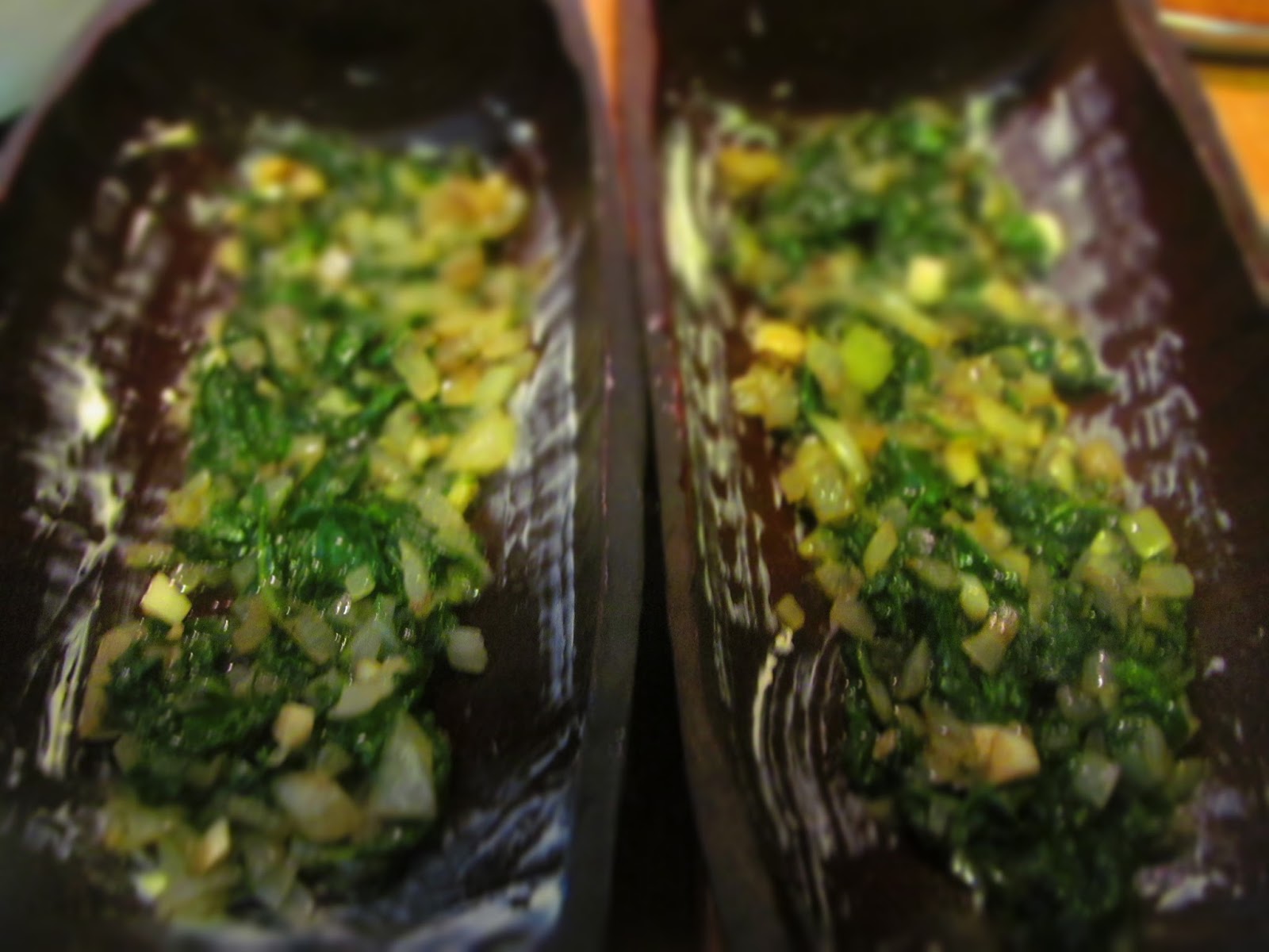 - Разпределям спанакът поравно на дъното на всяка керемида.