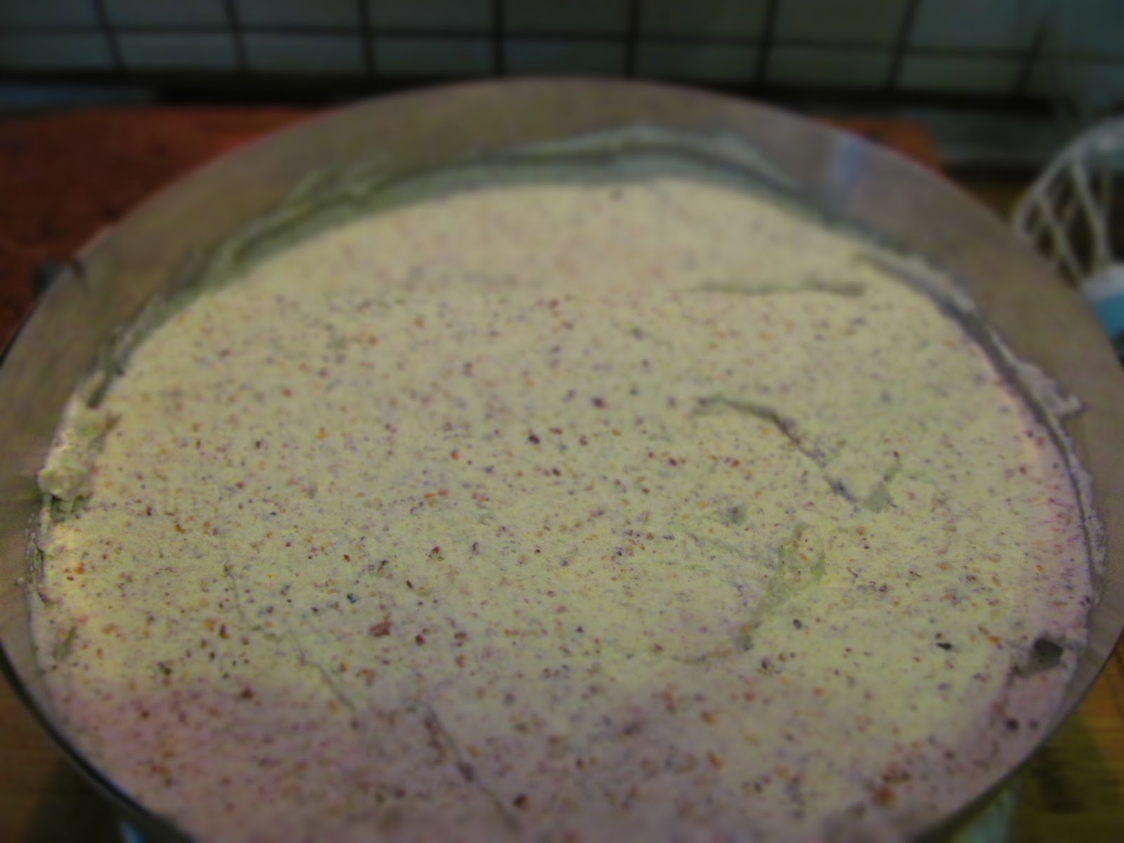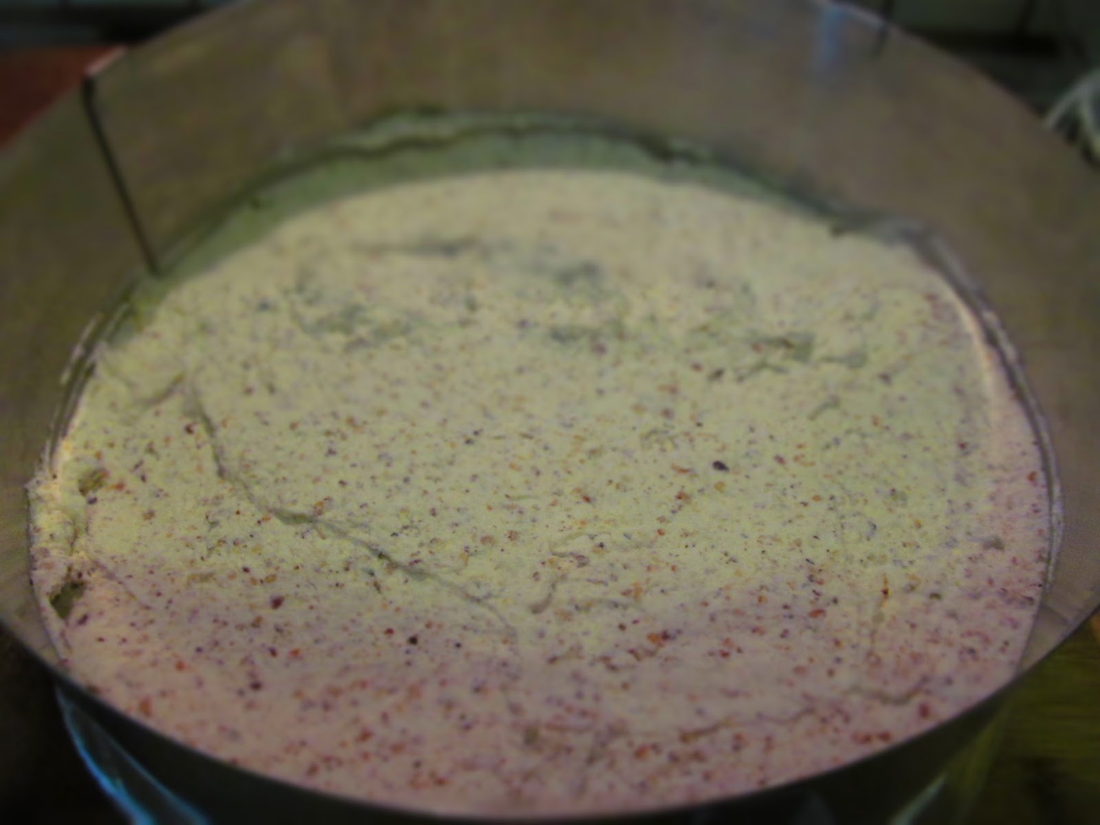 - Около първия блат захващам ринга за торта и намазвам с част от лешниковия крем.