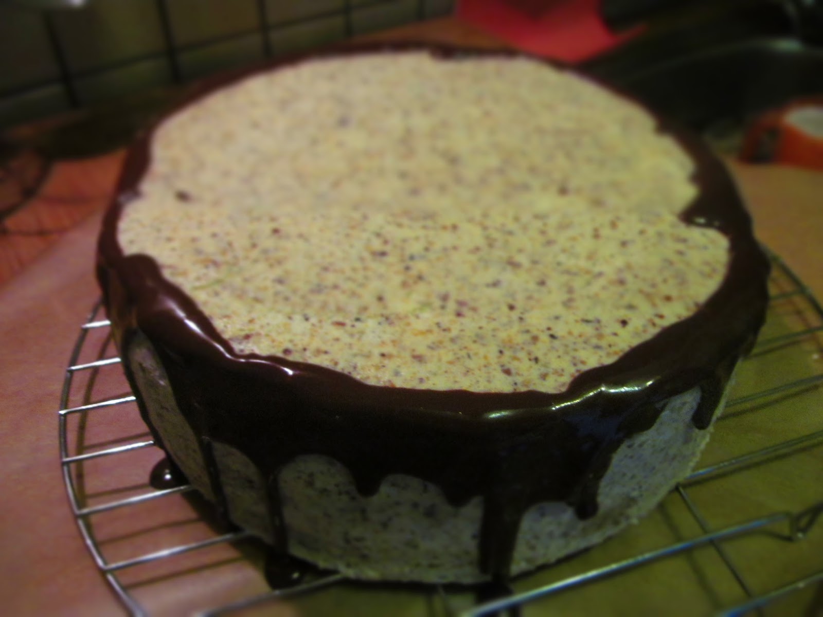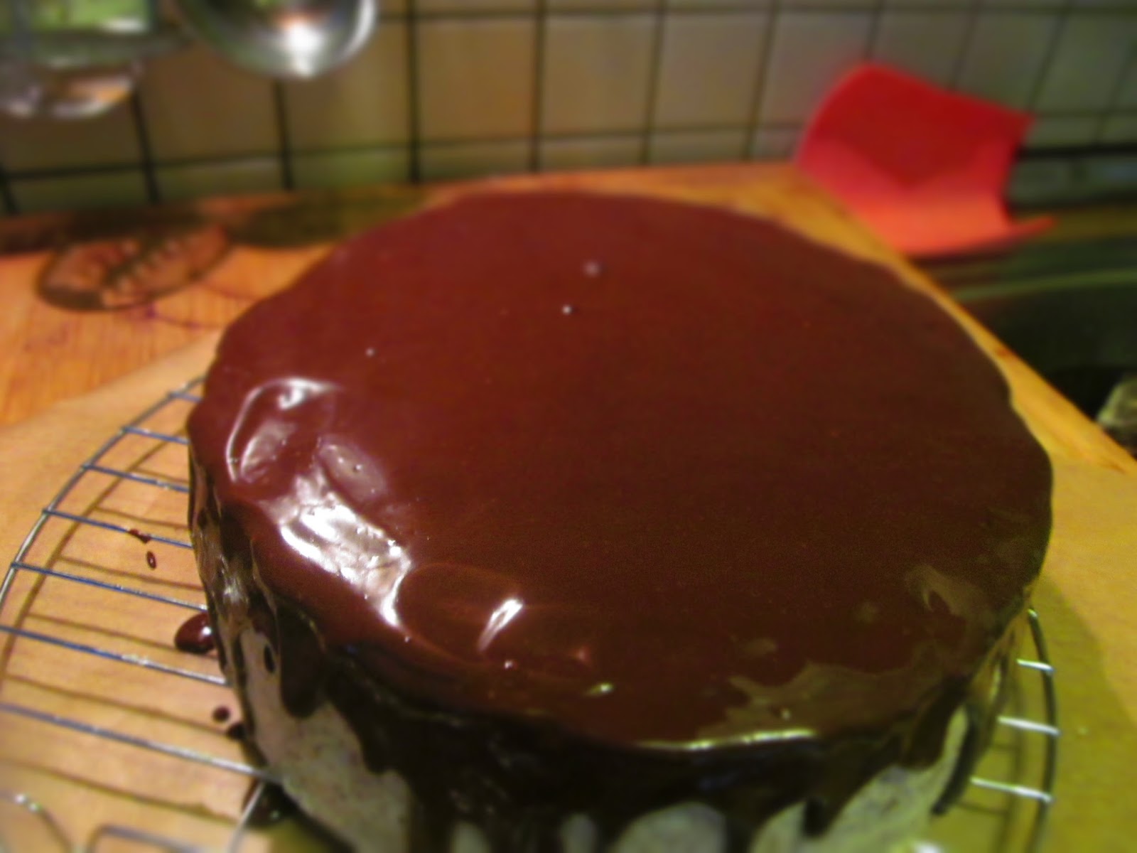 - Слагам тортата върху решетка и с помощта на лъжица започвам да сипвам от леко охладения шоколад само по ръба на тортата. Така, че шоколадът да се стече по стените на тортата.
