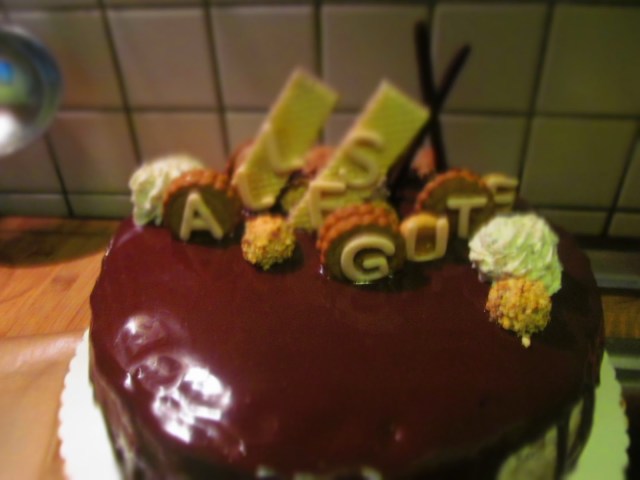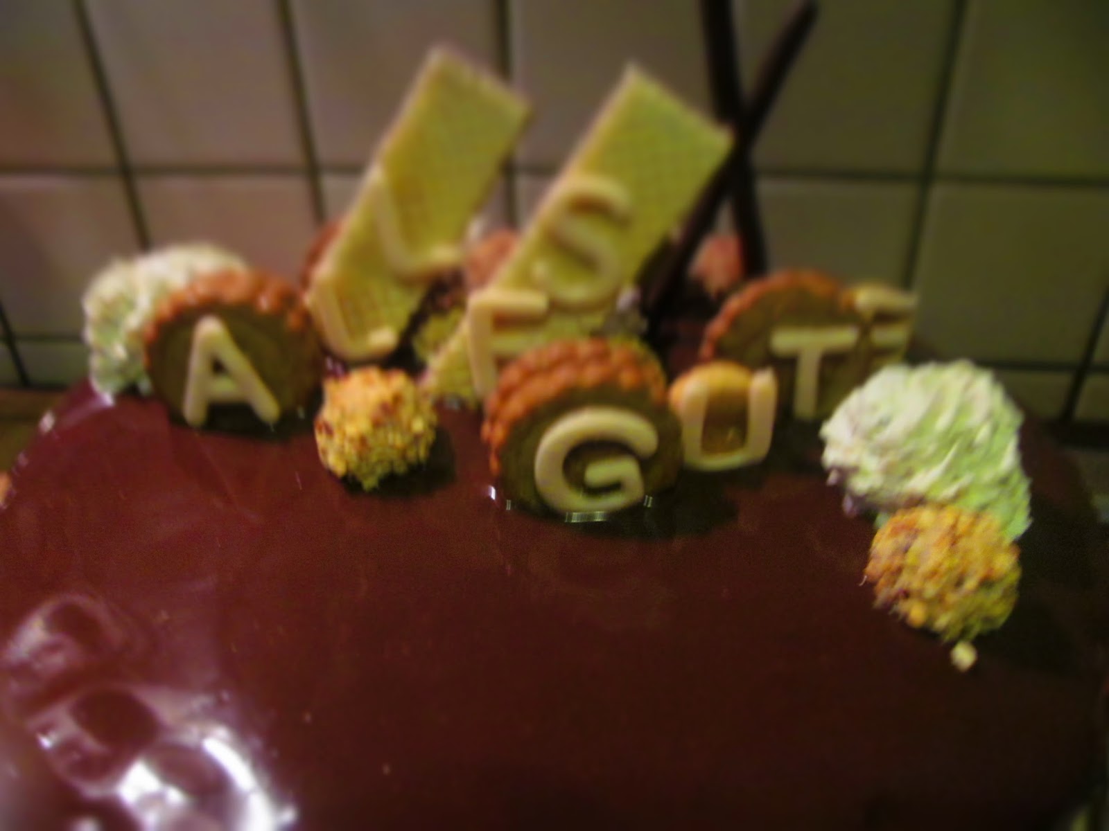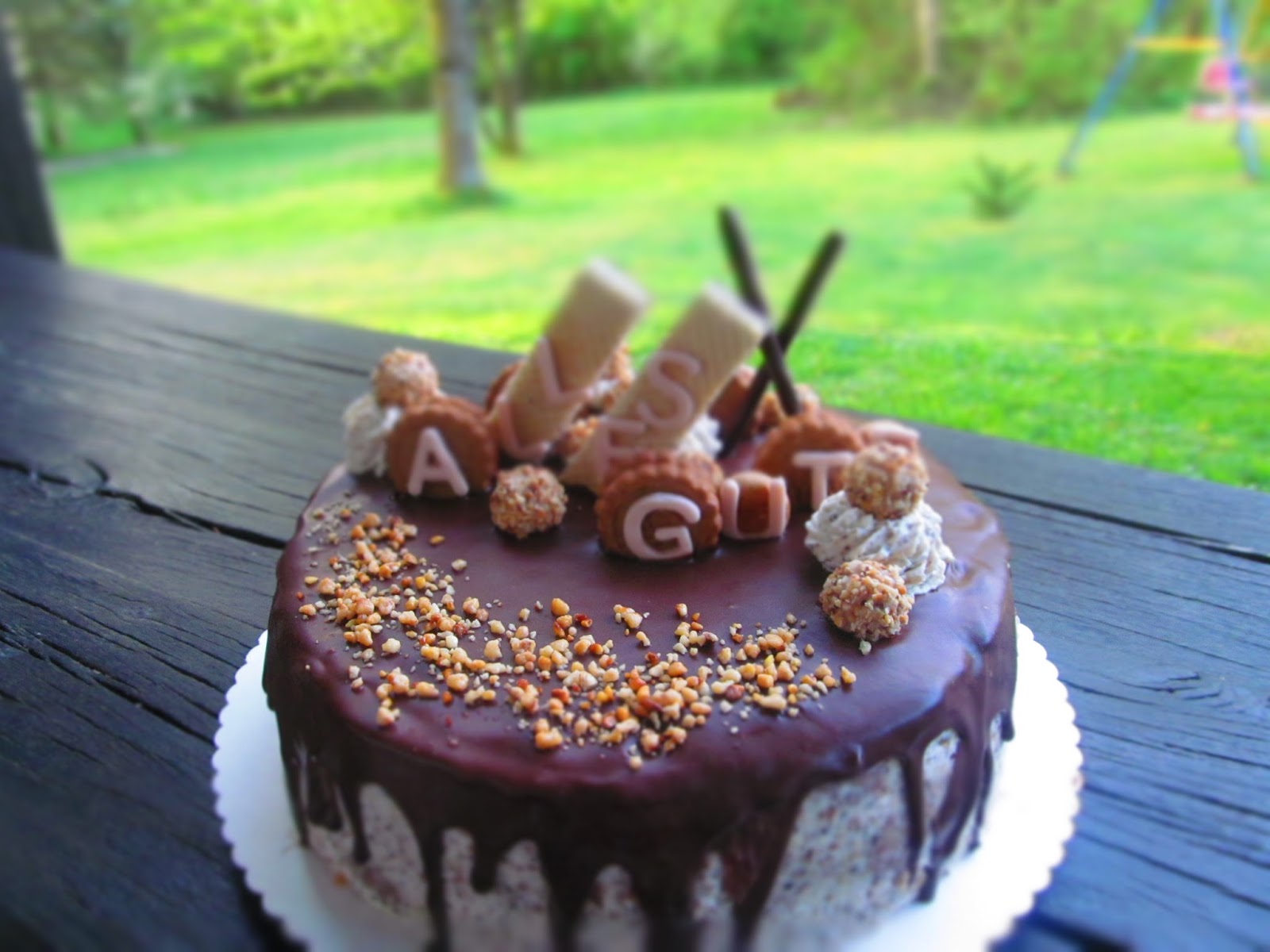 Аз нали съм се занимавала около 17 години с мода беше напълно естествено да съчетая цялата украса за тортата като, че ли съчетавах тоалет! Използвах вафли с лешников крем, мини бисквитки от лешниково тесто, слепени с пухкав млечен крем, шоколадово Микадо /това са шоколадовите солети/, собственоръчно изработени букви от захарна маса и разбира се бонбони Giotto /не не им правя реклама, просто ги обичам/.