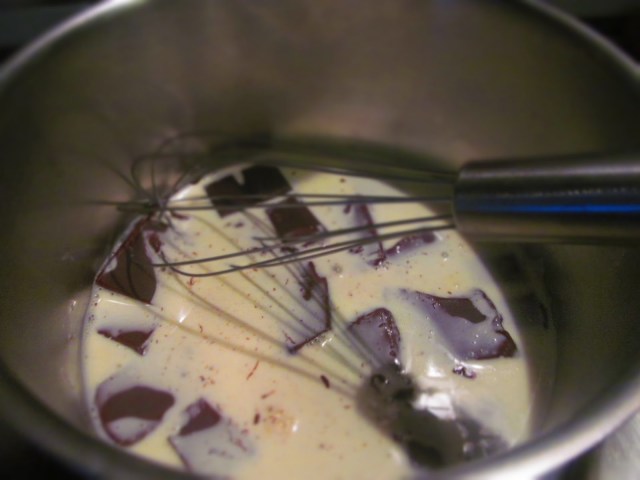 - В малка тенджерка загрявам сметаната до завиране. Отделям от котлона и начупвам в горещата сметана шоколада. Изчаквам 5 минути и разбърквам до пълното му разтопяване.