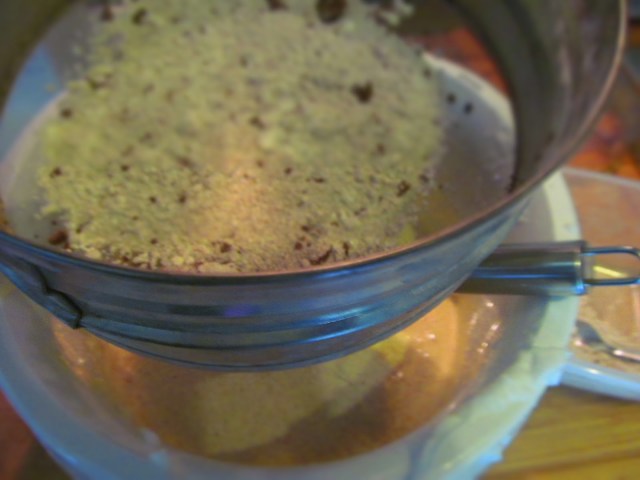 - Започвам да добавям от пресятото с бакпулвер и какао брашно. Добавям съвсем малко. Бъркам с телта, но много нежно, бавно, в една посока и от дъното на купата към повърхността.