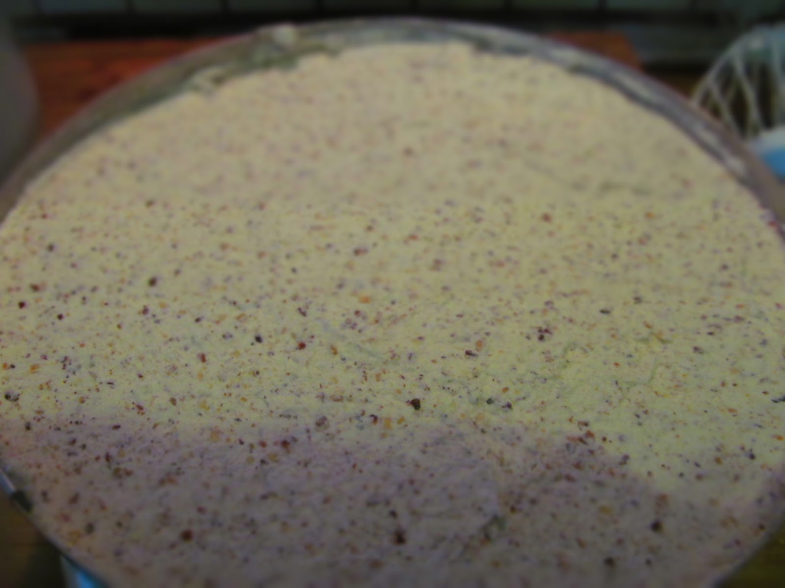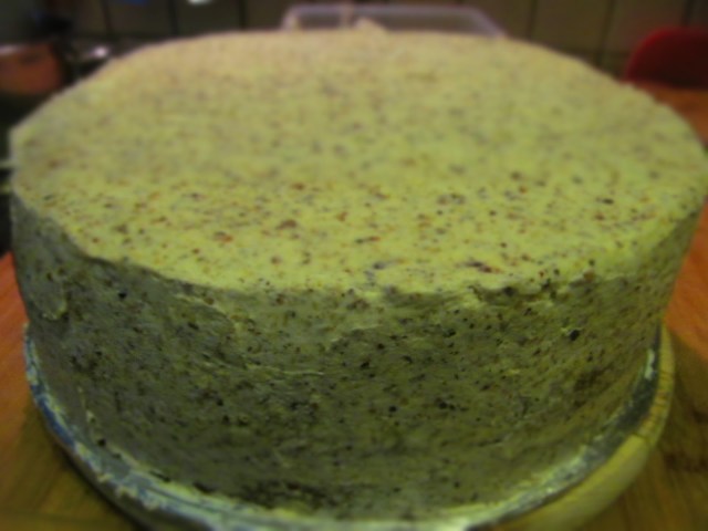 - През това време освобождавам тортата от ринга и измазвам странично с отделения крем.
