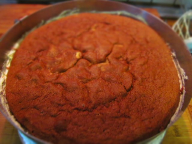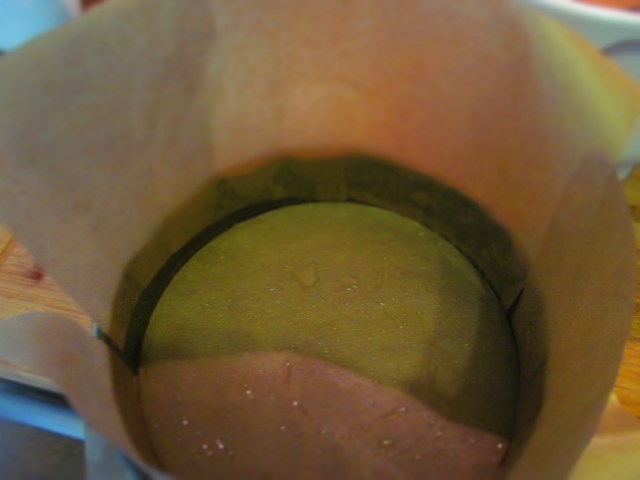 - Изсипвам пухкавата смес в предварително покрита с хартия за печене форма за торта с размер 24 см. И тъй като винаги много ми бухва блата, се налага да направя и повдигане на стените на формата също с хартия за печене. За целта е нужно да намажа с олио и стените. Така хартията залепва плътно.