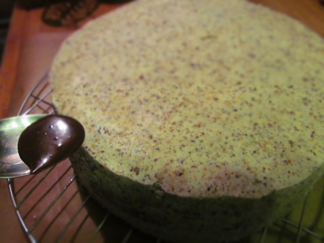 - После изсипвам останалото количество шоколад по средата на тортата и с леко накланяне на самата тортата го разпределям по цялата повърхност.