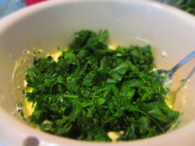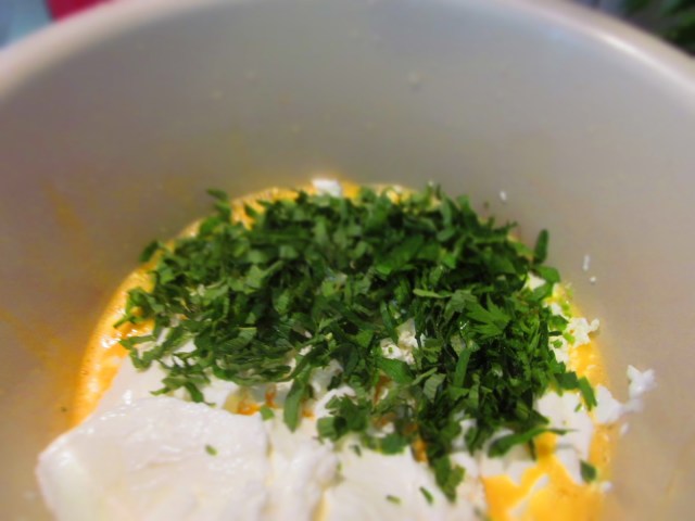 - Най-накрая добавям нарязаната на едро зеленийка. Разбърквам всичко.
