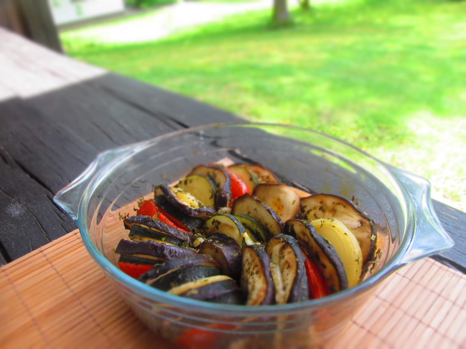 В кръгла стъклена тавичка с размер 20 см подреждам всичките зеленчуци, предварително нарязани на колелца като ги редувам. Поръсвам с мазнината и подправките.