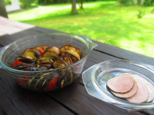 Това количество е огромно, но е една порция и трябва да се изяде. Сервирам и пилешкото филе преди рататуя, защото е протеин и се похапва преди въглехидратите.
