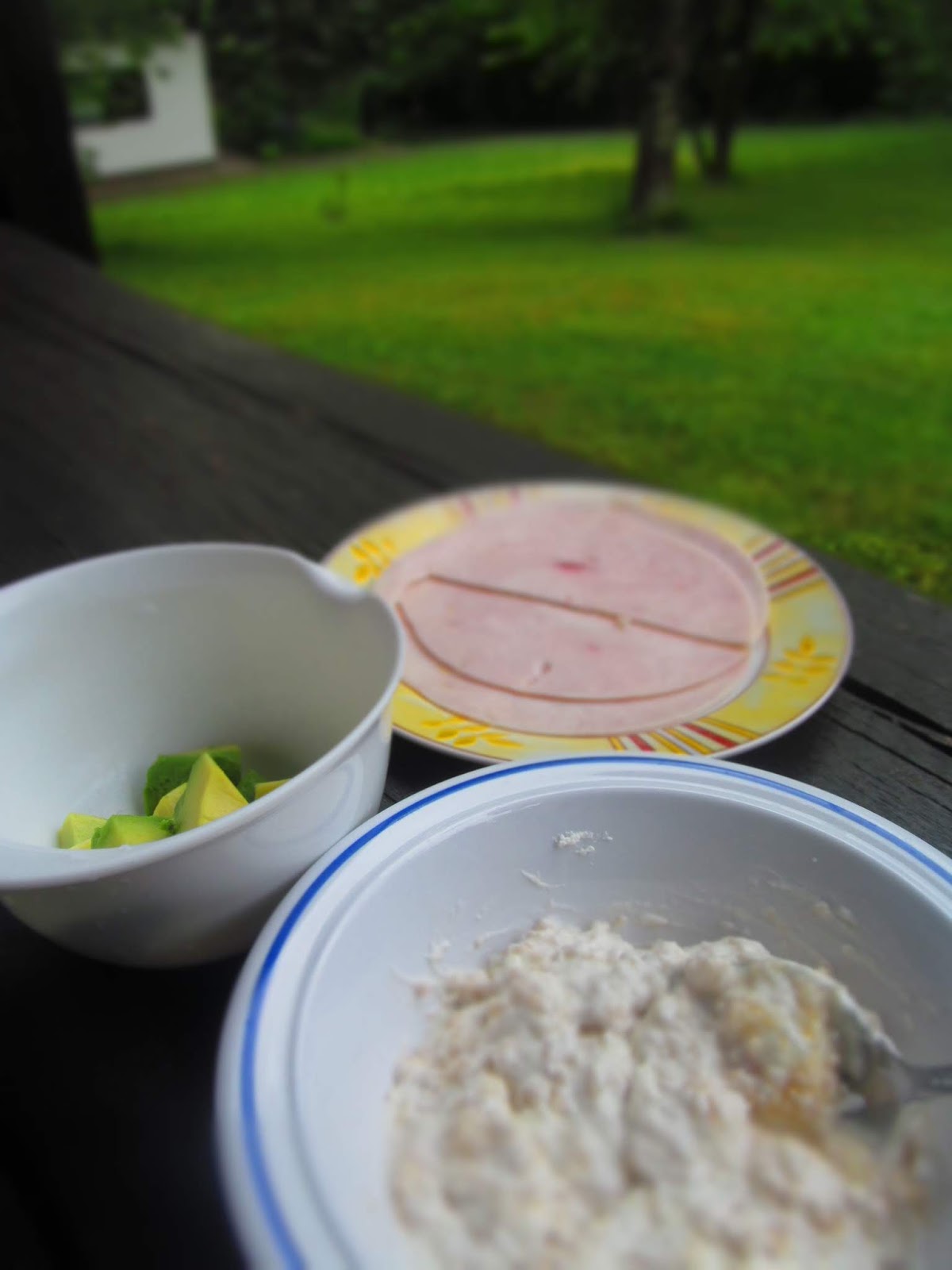 Започвам закуската с протеините, а именно шунката. Но, за да не ми е скучно похапването изяждам и авокадото.
