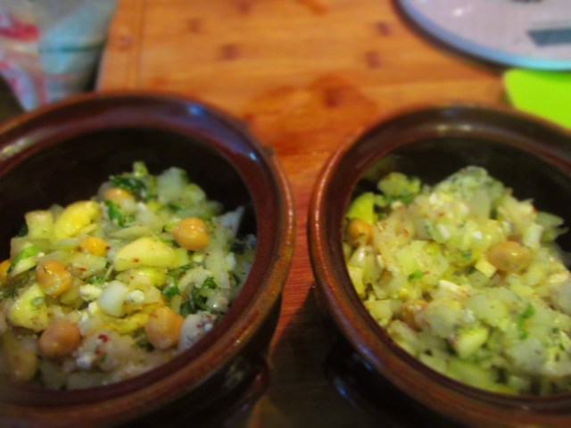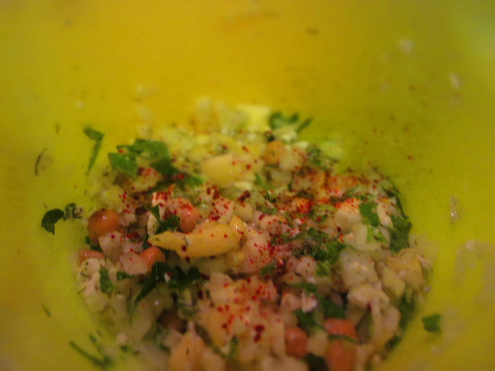 - В купа смесих нарязаната на ситно издълбана вътрешност на тиквичката, нахуд, нарязания на ситно кромид лук, белтъците, натрошеното сирене, малко сол за вкус, нарязаните на ситно зелени подправки от градината, с които разполагате. Аз имах магданоз, джоджен, мента, босилек, копър. Добавих с.ъщо черен пипер и щипка чили. Разбърках всичко.