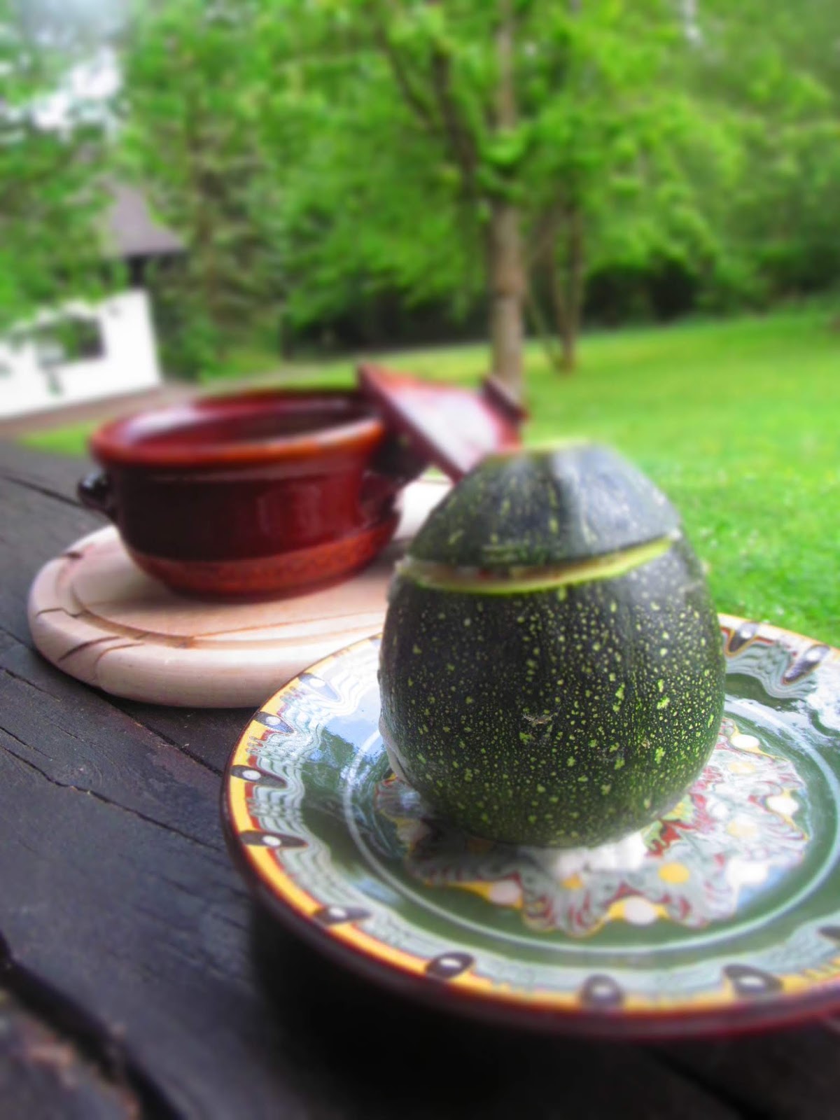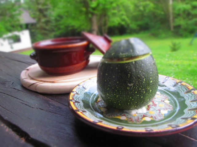- От плънката ми остана голямо количество, което разделих в две гюведжета и пекох заедно с тиквичките. Сервирам също с тиквичките, защото количеството е измерено и принадлежи към същата зонова вечеря.