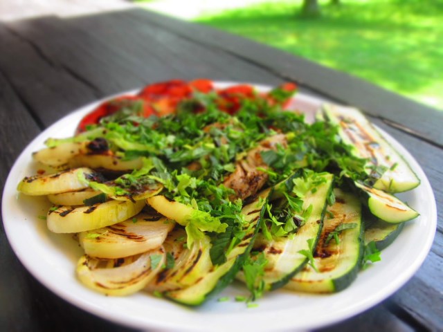 Намазвам оребрения тиган с мазнина и загрявам. Започвам печенето с пуешките гърди. Пека много кратко, защото ги обичам сочни. После тиквичките, нарязани на дебели 5 мм филии по дължина, кромидия лук – нарязан на дебели филии и доматите, нарязани също на дебели филии. При първото обръщане поръсвам с подправената сол. Тук тя се продава така – овкусена с много и различни билки и подправки. Подреждам всички зеленчуци и пуешкото филе в голяма чиния, поръсвам с няколко капки балсамов оцет и обилно със зелени подправки от градината.