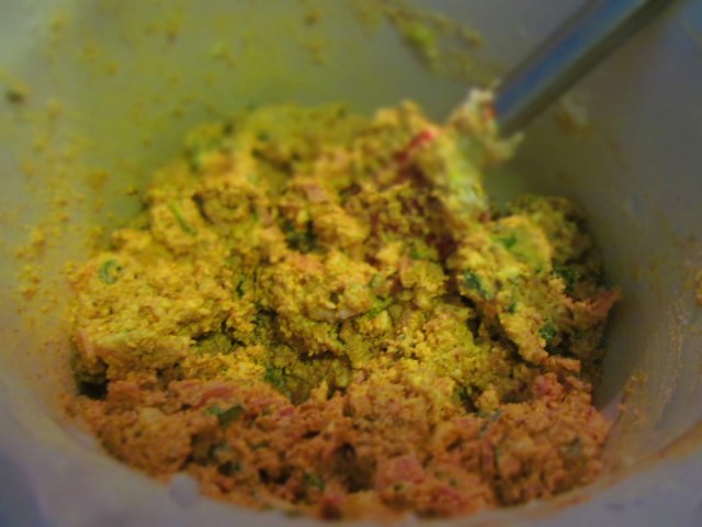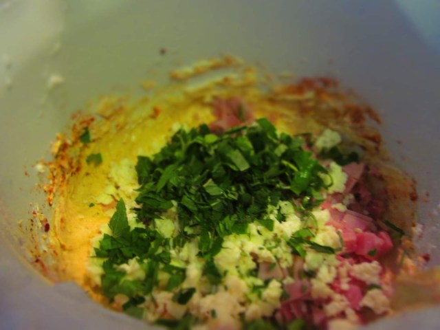 - Към разбитата и подправена извара добавих нарязаната на ситно шунка, сиренето и билките. Разбърках със силиконовата лопатка.